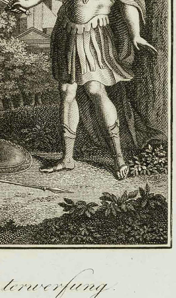 - Beschreibung: Zeigt eine szenische Darstellung, in der sich der Führer der Gibeoniter Josua unterwirft. Illustration zu der Bibelstelle Jousa 9, 5-10. Die Darstellung stammt aus Die Heiligen Schriften des Alten Testaments in Hundert Biblischen Kupfern dargestellt | Gestochen unter der Leitung von Carl Schuler | Freiburg in der Herder’schen Kunst und Buchhandlung, erschienen um 1820.