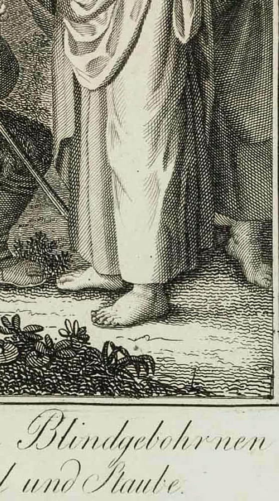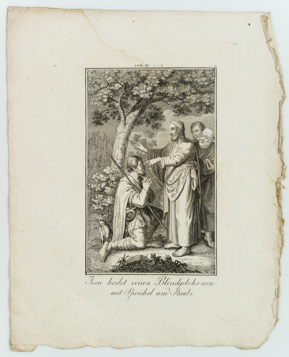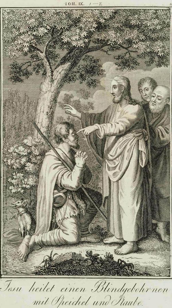 - Description: Showing the miraculous scene in which Jesus heals a blind man. Illustration of the biblical passage John 9, 1-7. The illustration comes from Die Heiligen Schriften des Neuen Testaments in Hundert Biblischen Kupfern dargestellt | Gestochen unter der Leitung von Carl Schuler | Freiburg in der Herder’sche Kunst und Buchhandlung, published around 1820.