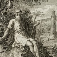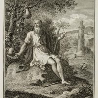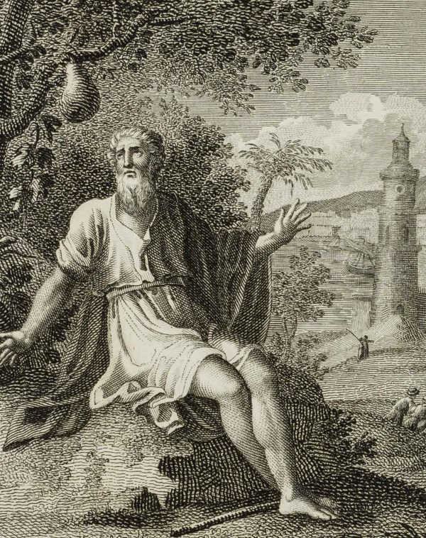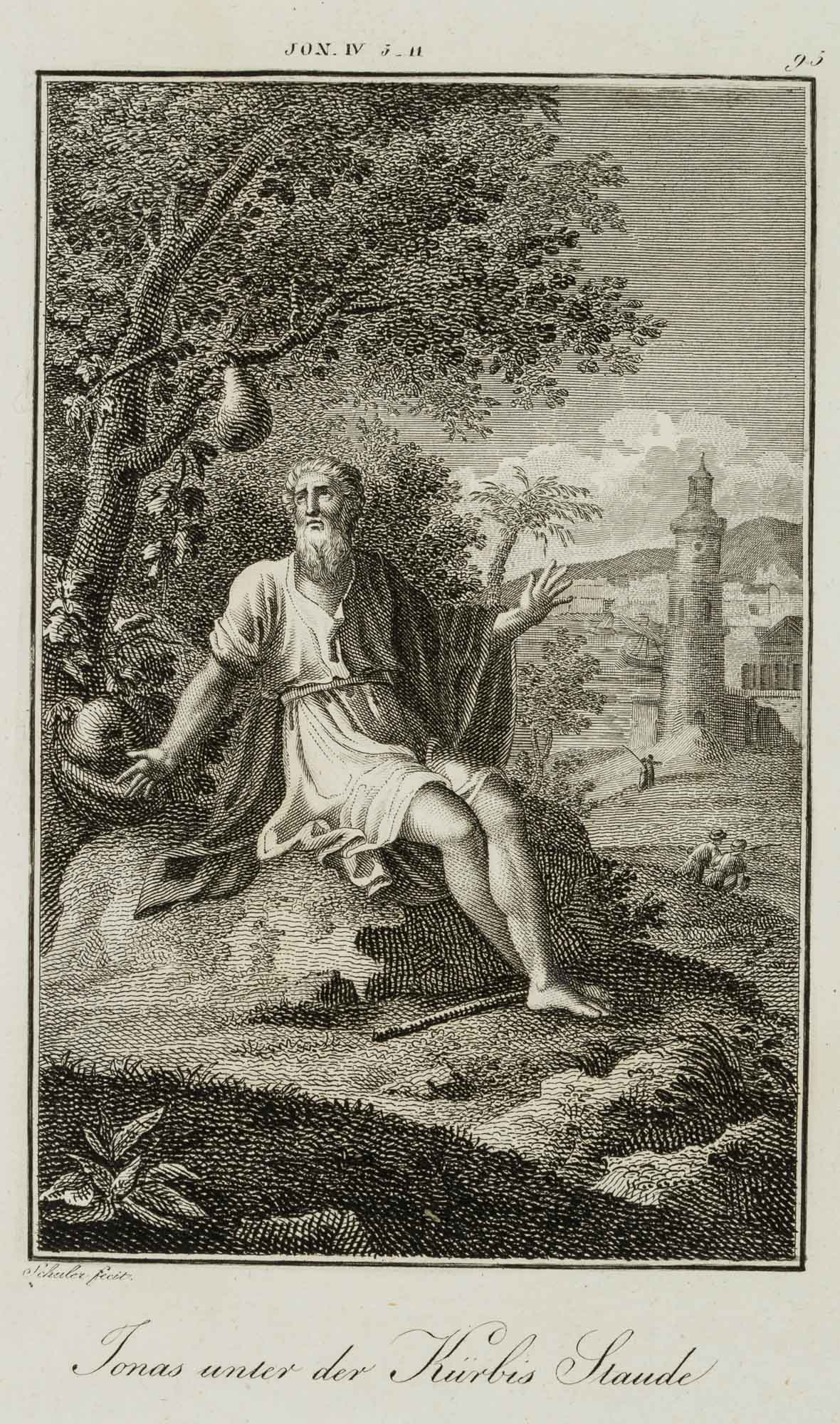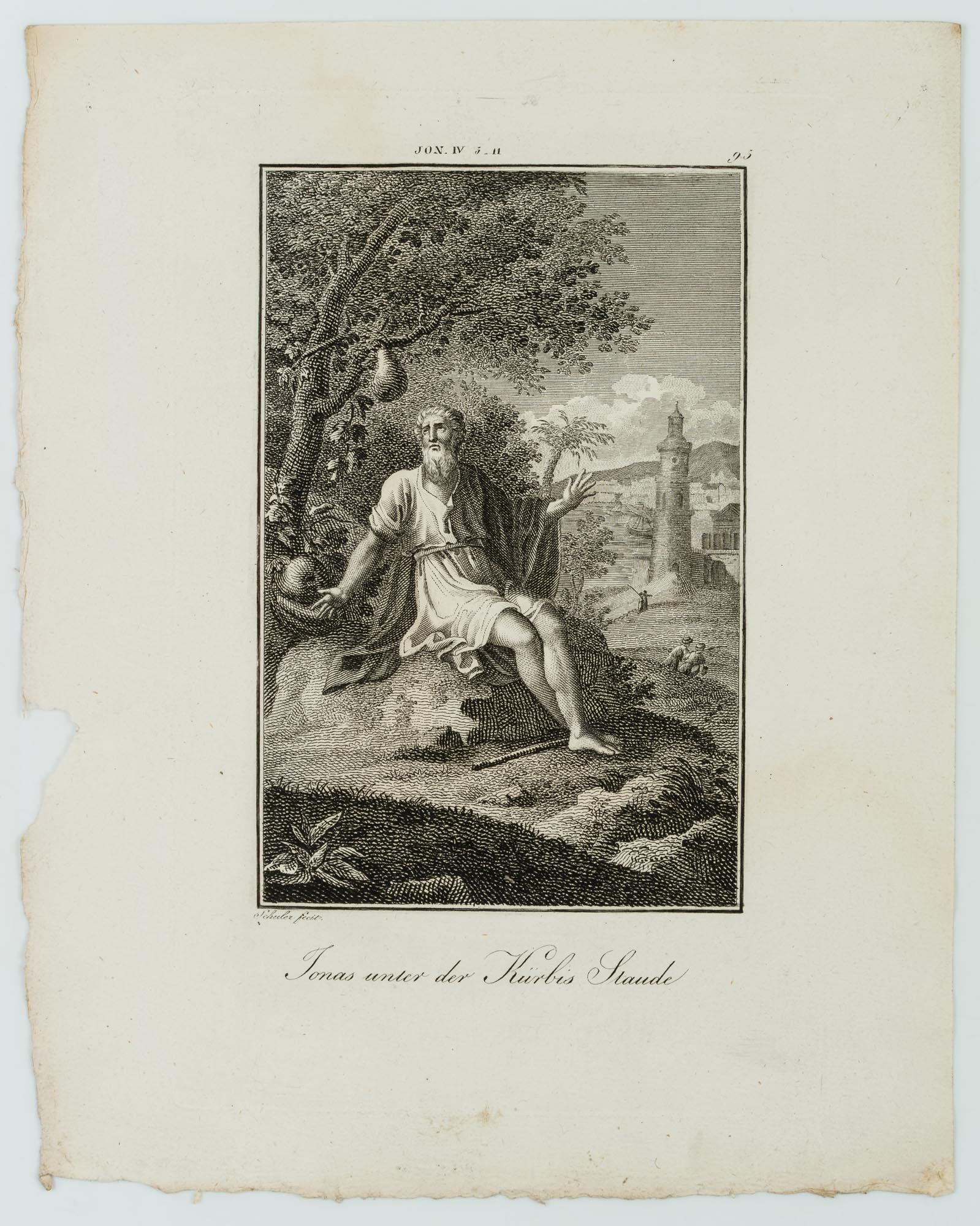 - Description: Shows a scenic illustration with Jonah sitting under a shade-giving castor bean plant outside the gates of the city. Illustration of the biblical passage Jon. IV 5-11. The illustration is taken from Die Heiligen Schriften des Alten Testaments in Hundert Biblischen Kupfern dargestellt | Gestochen unter der Leitung von Carl Schuler | Freiburg in der Herder’sche Kunst und Buchhandlung, published around 1820. Inscribed above and below the illustration in the printing plate.
