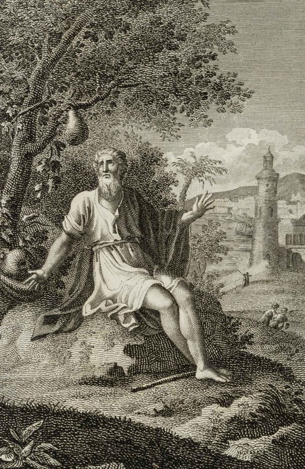 Charles Louis Schuler (um 1782 Straßburg – 1852 Lichtenthal), Bibelillustration. Jona unter der Kürbis Staude (Rizinus Pflanze) sitzend, um 1820, Kupferstich