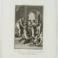 - Description: Shows a scenic representation of Queen Sheba, who has heard of King Solomon’s wisdom and arrives at his court in Jerusalem. Illustration of the biblical passage 1. Book of Kings 10, 1-13. Overwhelmed by the sight of him, she gives him several talents of gold. The illustration is taken from Die Heiligen Schriften des Alten Testaments in Hundert Biblischen Kupfern dargestellt | Gestochen unter der Leitung von Carl Schuler | Freiburg in der Herder’sche Kunst und Buchhandlung, published around 1820. Inscribed above and below the illustration in the printing plate.