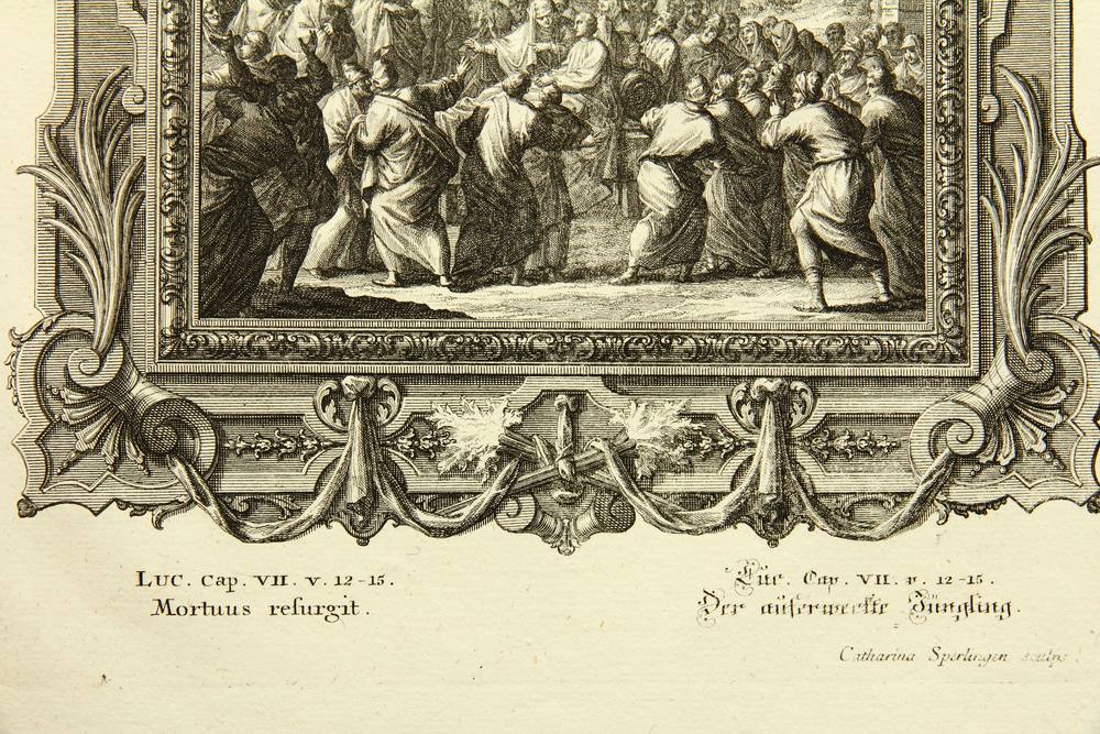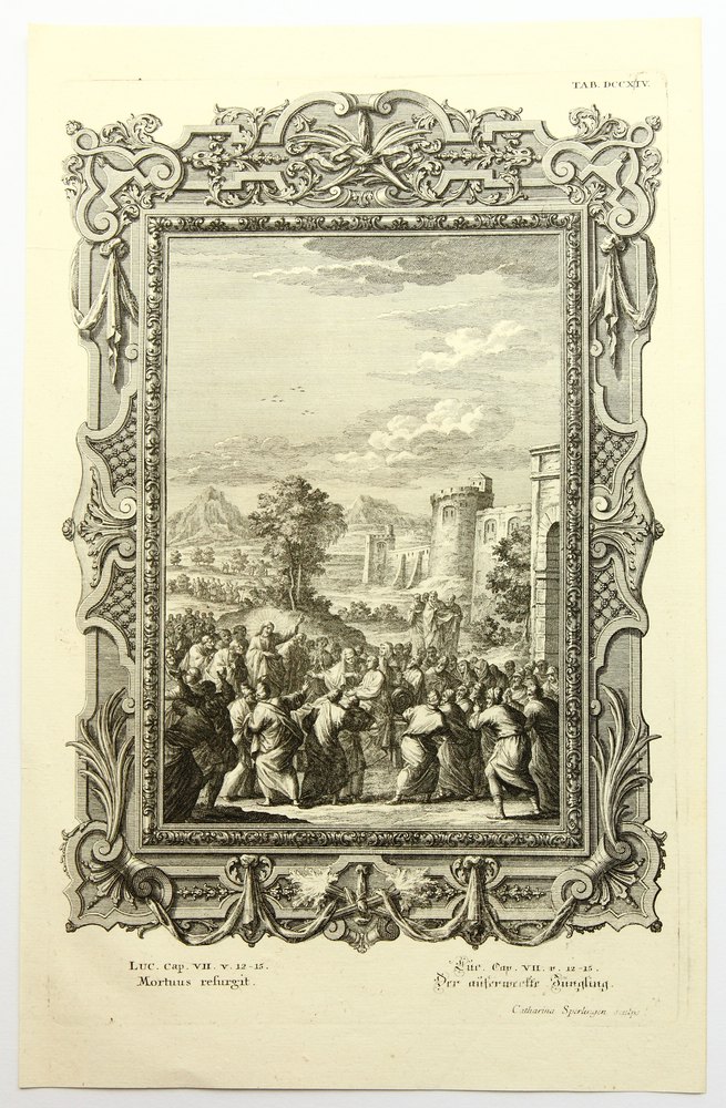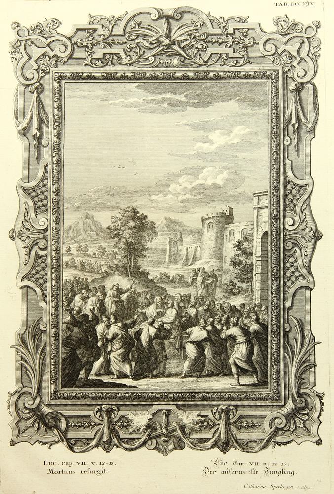 - Beschreibung: Darstellung einer Bibelillustration aus Lukas 7,12-15. Jesus Christus erweckt einen toten Jüngling zum Leben.