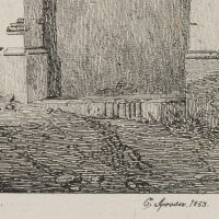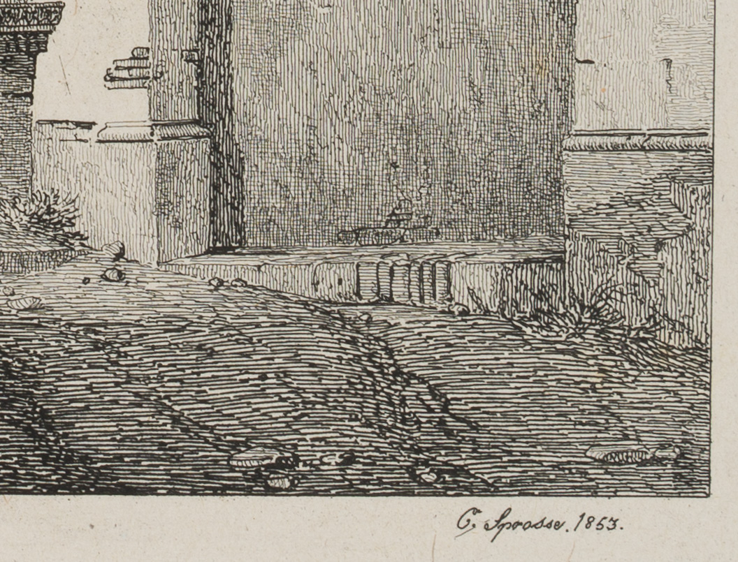 - Bezeichnung: Unterhalb der Darstellung rechts signiert und datiert: “C.’ Sprosse. 1853.”; unterhalb davon in der Mitte bezeichnet “Arco di Settimio Severo al Velabro in Roma.”