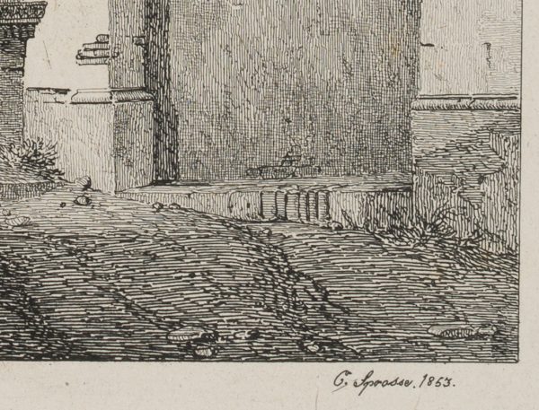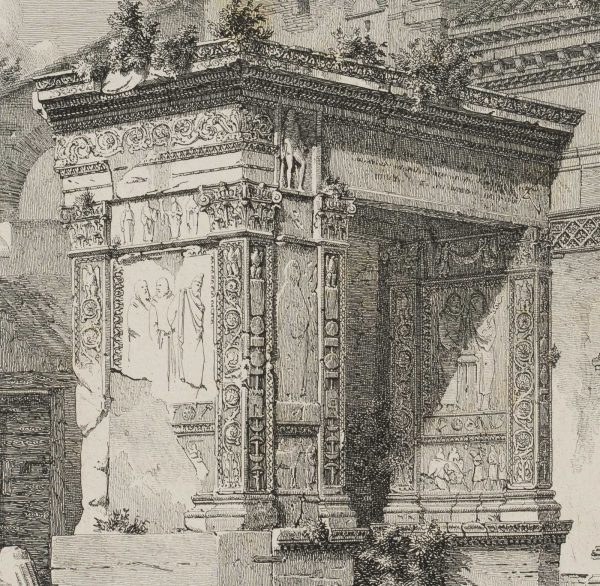 Carl Ferdinand Sprosse (1819 Leipzig – 1874 ibid.), Italy: View of the Argent Arch in Rome, arch of the money changers next to the basilica / “ARCO DI SETTIMIO SEVERO AL VELABRO IN ROMA”, 1853, Etching