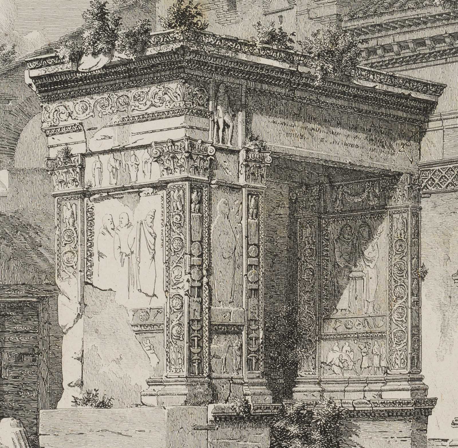 Carl Ferdinand Sprosse (1819 Leipzig – 1874 ebd.), Italien: Ansicht des Argentarierbogens in Rom, Bogen der Geldwechsler neben der Basilika / “ARCO DI SETTIMIO SEVERO AL VELABRO IN ROMA”, 1853, Radierung