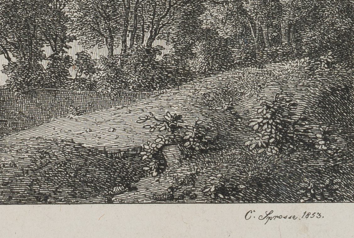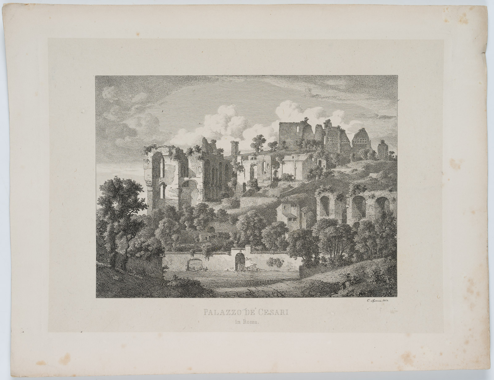 - Bezeichnung: Unterhalb der Darstellung rechts signiert und datiert: “C.’ Sprosse. 1853.”; unterhalb davon in der Mitte bezeichnet “Palazzo de Cesari in Roma.”