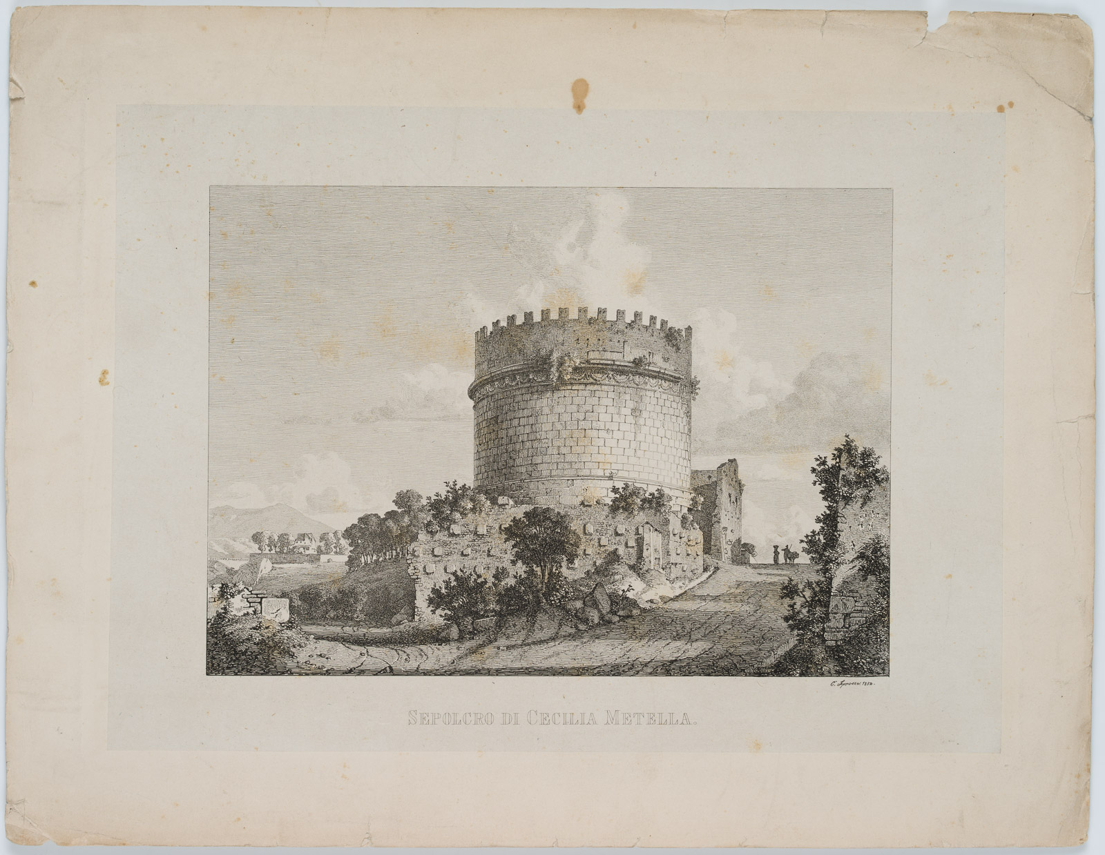 - Bezeichnung: Unterhalb der Darstellung rechts signiert und datiert: “C.’ Sprosse. 1852.”; unterhalb davon in der Mitte bezeichnet “Sepolcro di Cecilia Metella”
