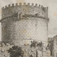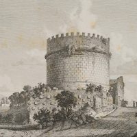 - Description: The well-known tomb is a round tower-like square building crowned with battlements. On the right, at the level of the Via Appia, a muleteer can be seen talking to a woman. In the distance, a piece of the Albano Mountains.