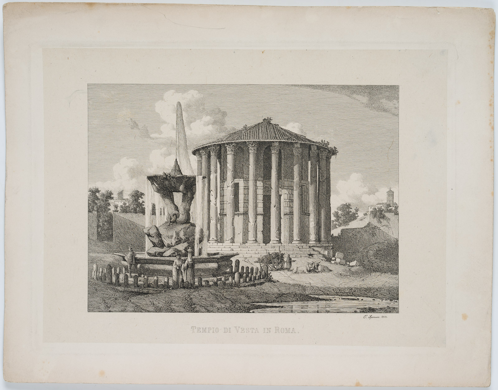 - Inscription: Signed and dated below the image on the right: “C.’. Sprosse. 1853.”; inscribed below it in the centre “Tempio di Vesta in Roma.”