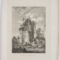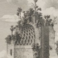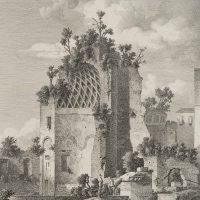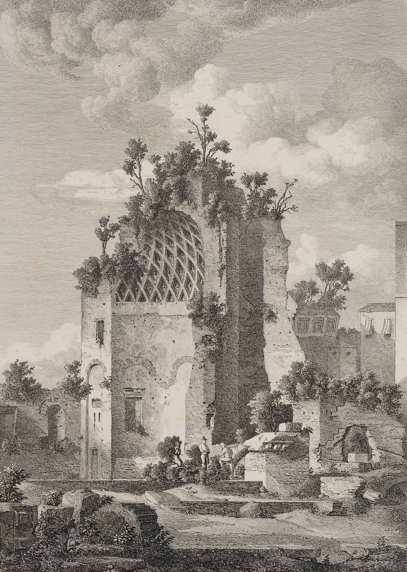 - Beschreibung: Die Überreste des Doppeltempels der Venus und Roma. Die kassetierte Apsis ist größtenteils zerstört, Vegetation hat sich der Ruine ermächtigt. Mauer und Säulenüberreste sind im Vordergrund verteilt. Am Fuß der Ruine sind zwei Männer mit dem Fällen eines Baumes beschäftigt.