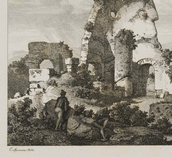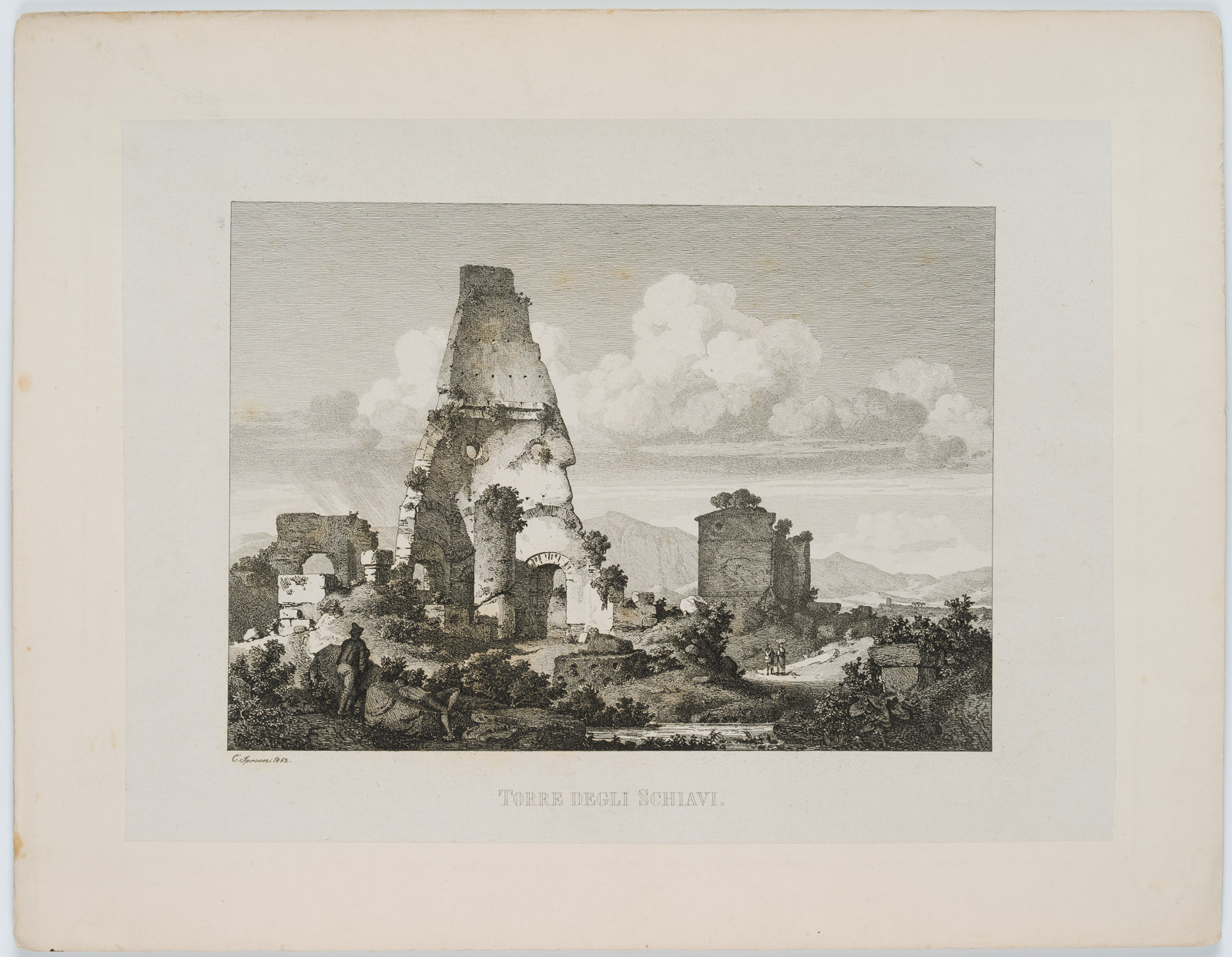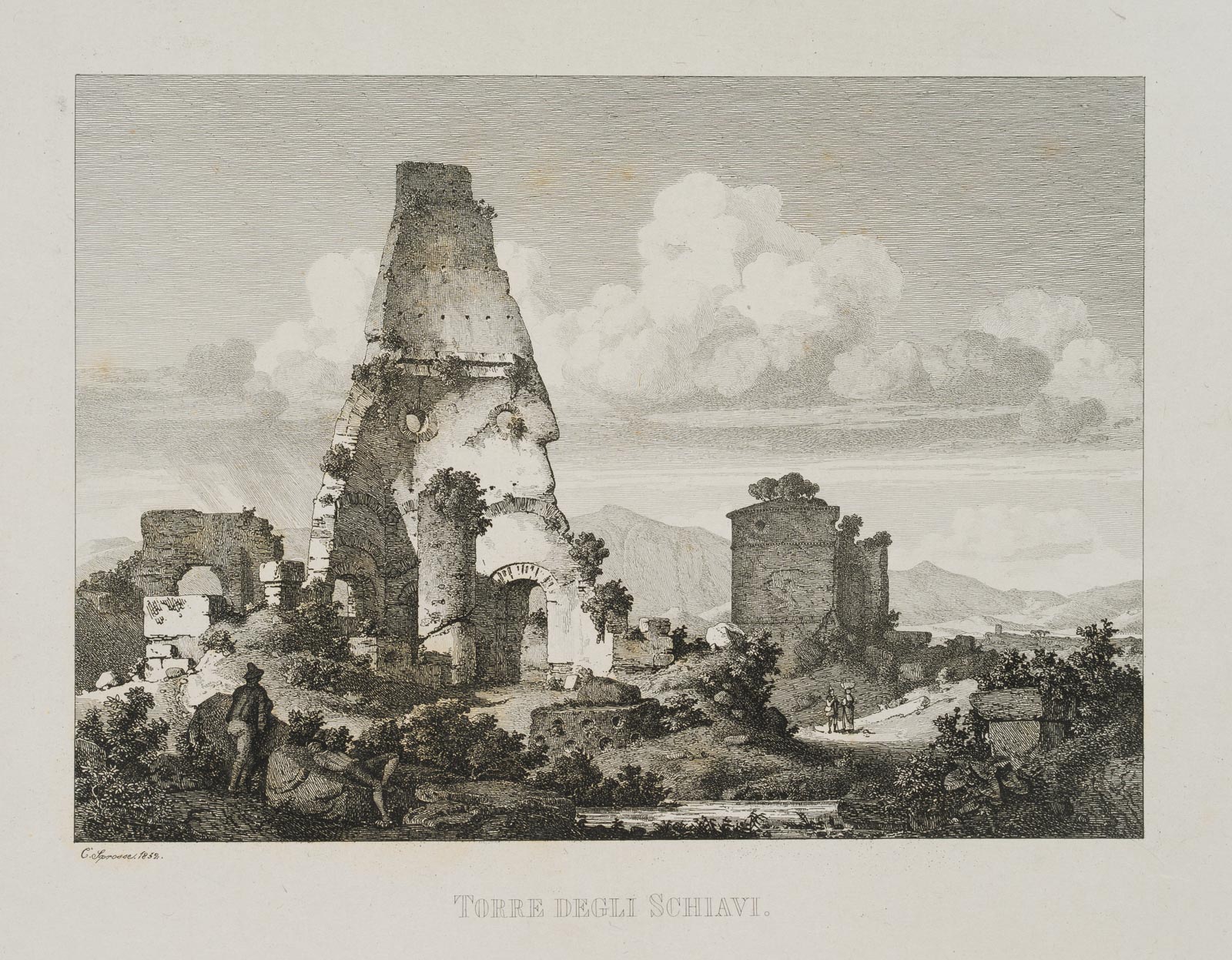 - Inscription: Signed and dated below the image on the left: “C.’. Sprosse. 1852.”; inscribed below it in the centre “Torre degli Schiavi”.
