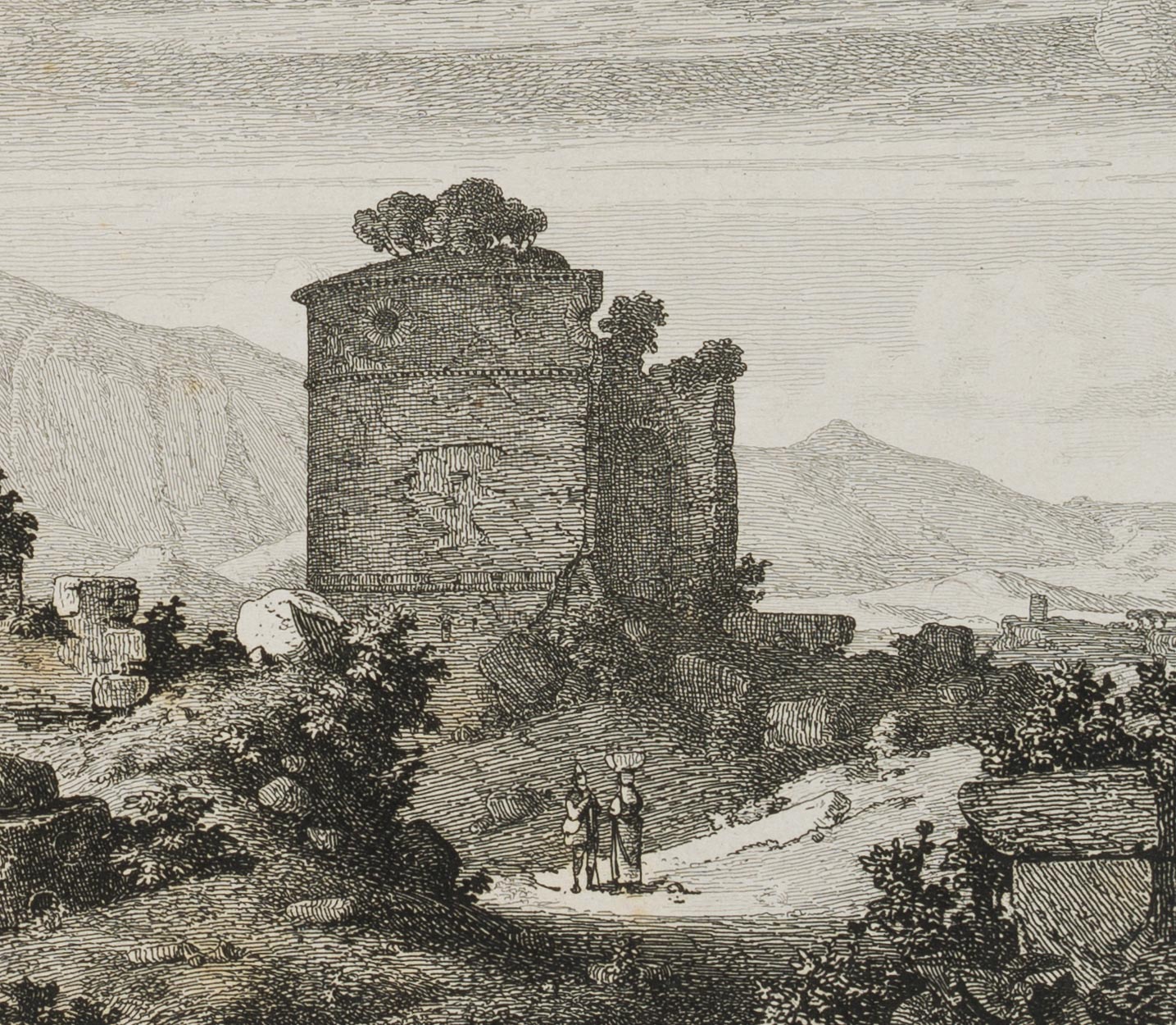 Carl Ferdinand Sprosse (1819 Leipzig – 1874 ibid.), View of the so-called slave towers in the Campagna / “TORRE DEGLI SCHIAVI”, 1852, Etching
