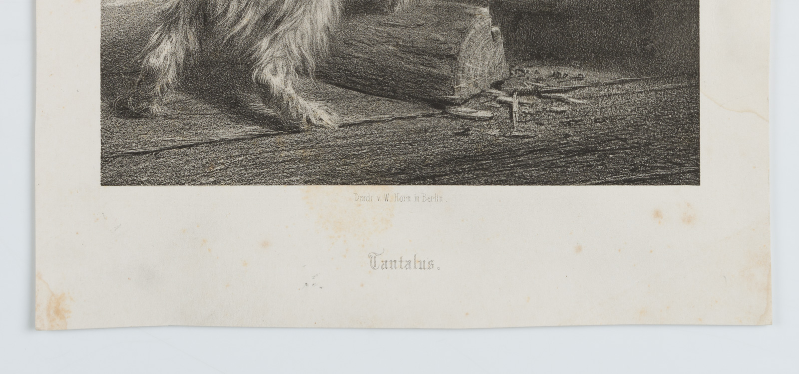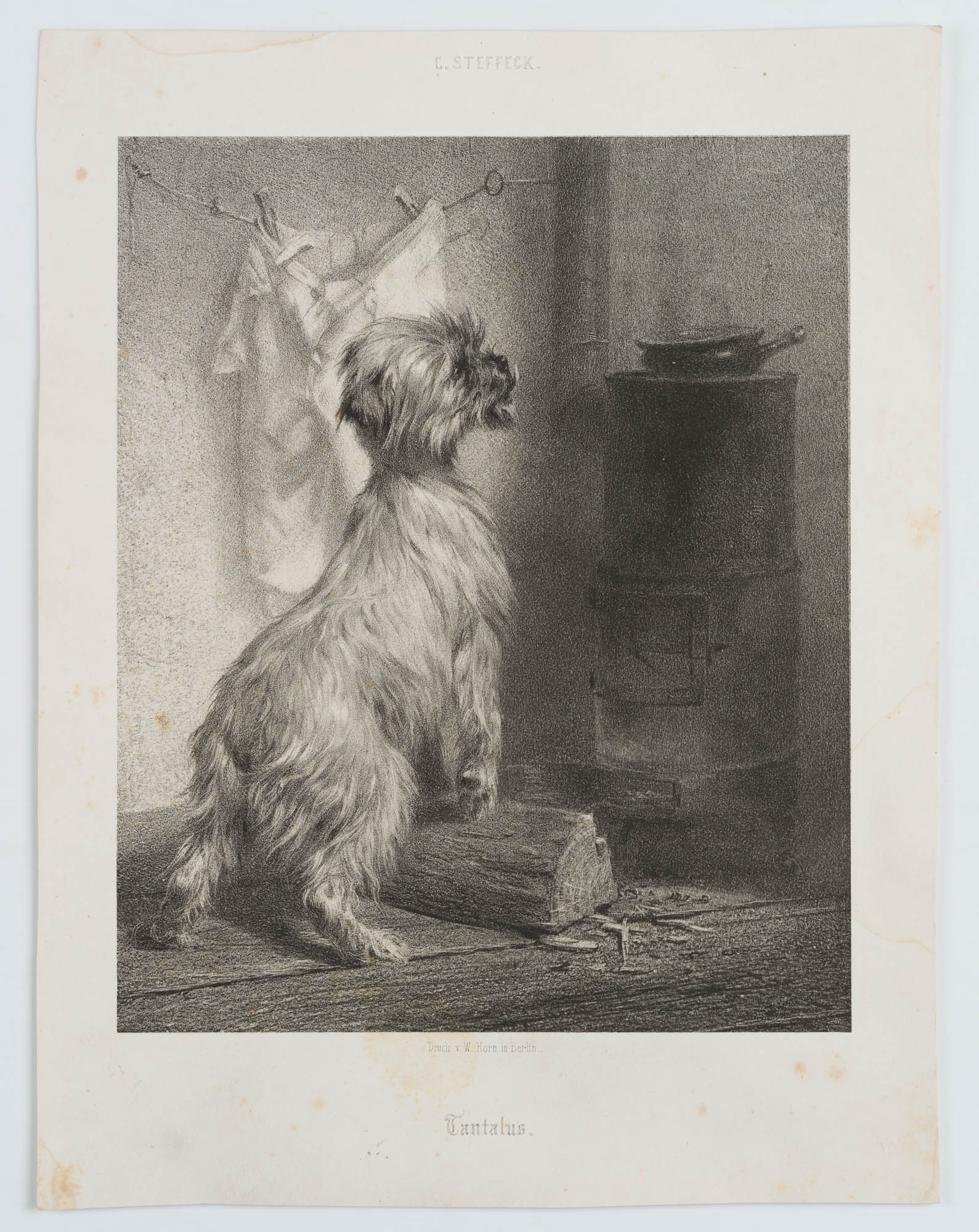 • Description: Bright little dog in the interior with a split piece of firewood in front of a stove. Next to it a pair of trousers hanging on a line to dry. Signed in the centre above the print, inscribed “Tantalus” in the centre below. Below the name of the printer: “Druck v. W. Horn in Berlin”.