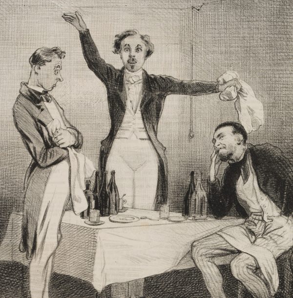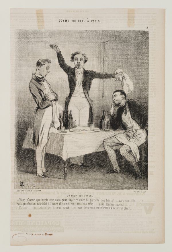 Caption. Translated from French: “ UN TROP BON DINER. – We only have thirty-five sous to pay for dinner for forty-five francs….But…idea…I’ll take a convertible and drive to all our friends…we’re saved!