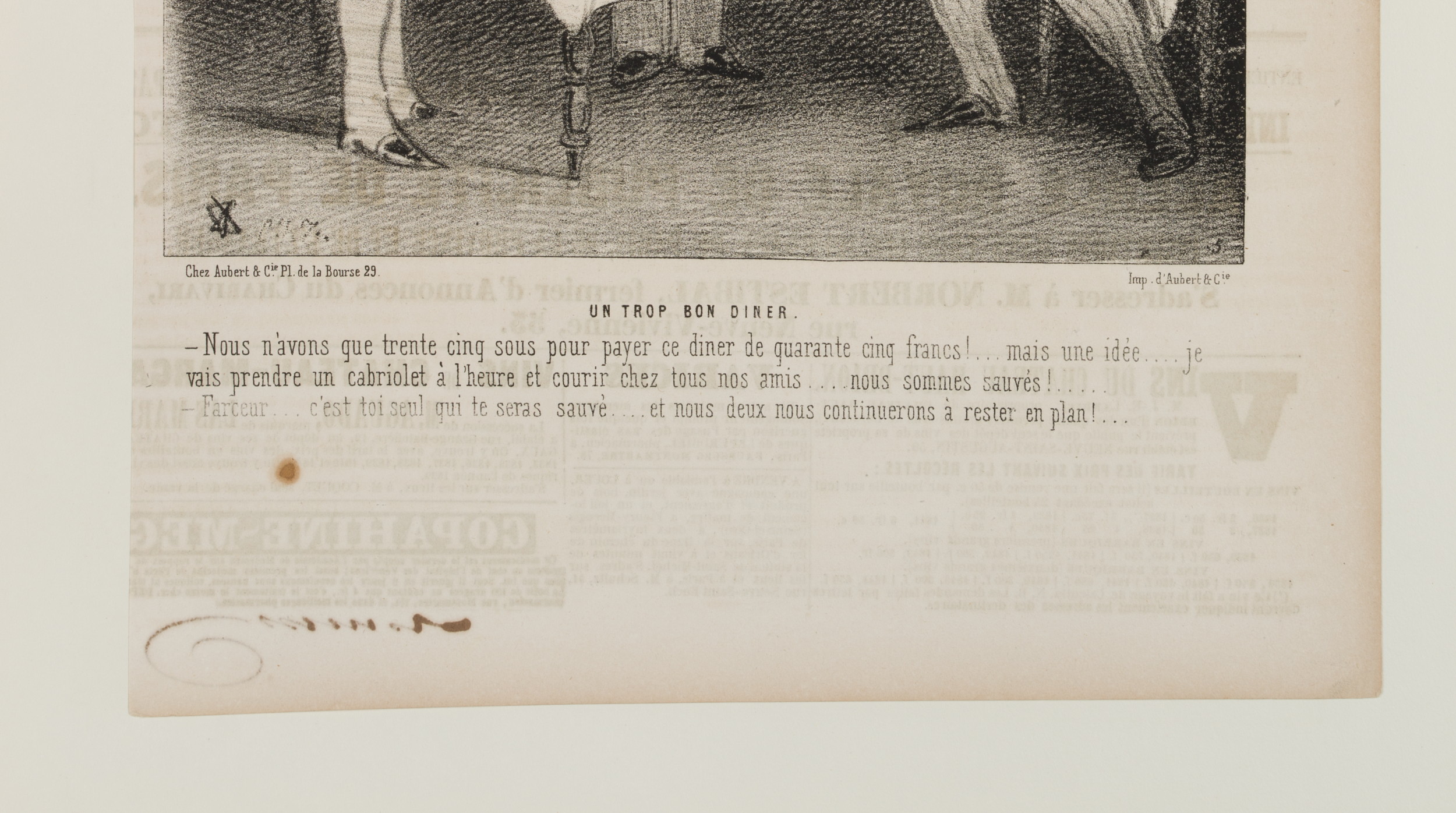 Bildunterschrift. Aus dem Französischen übersetzt: “ UN TROP BON DINER. – Wir haben nur fünfunddreißig Sous, um das Abendessen für fünfundvierzig Franken zu bezahlen….Aber…Idee…ich nehme mir ein Cabrio und fahre zu all unseren Freunden…wir sind gerettet!