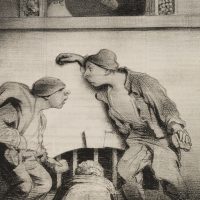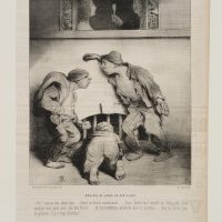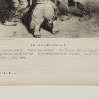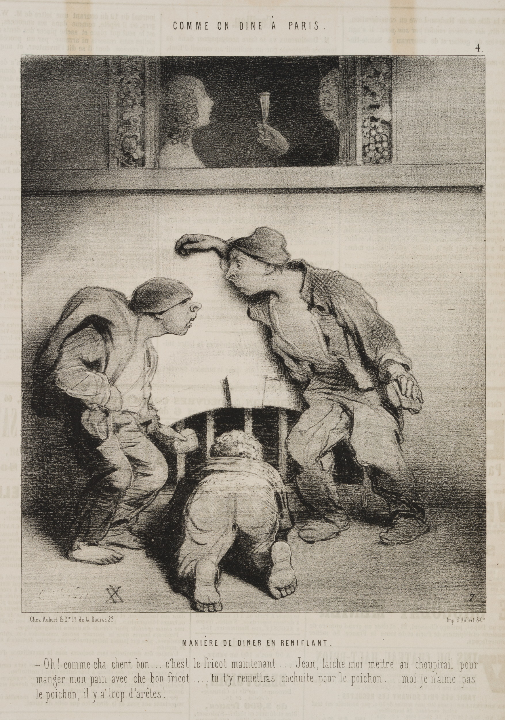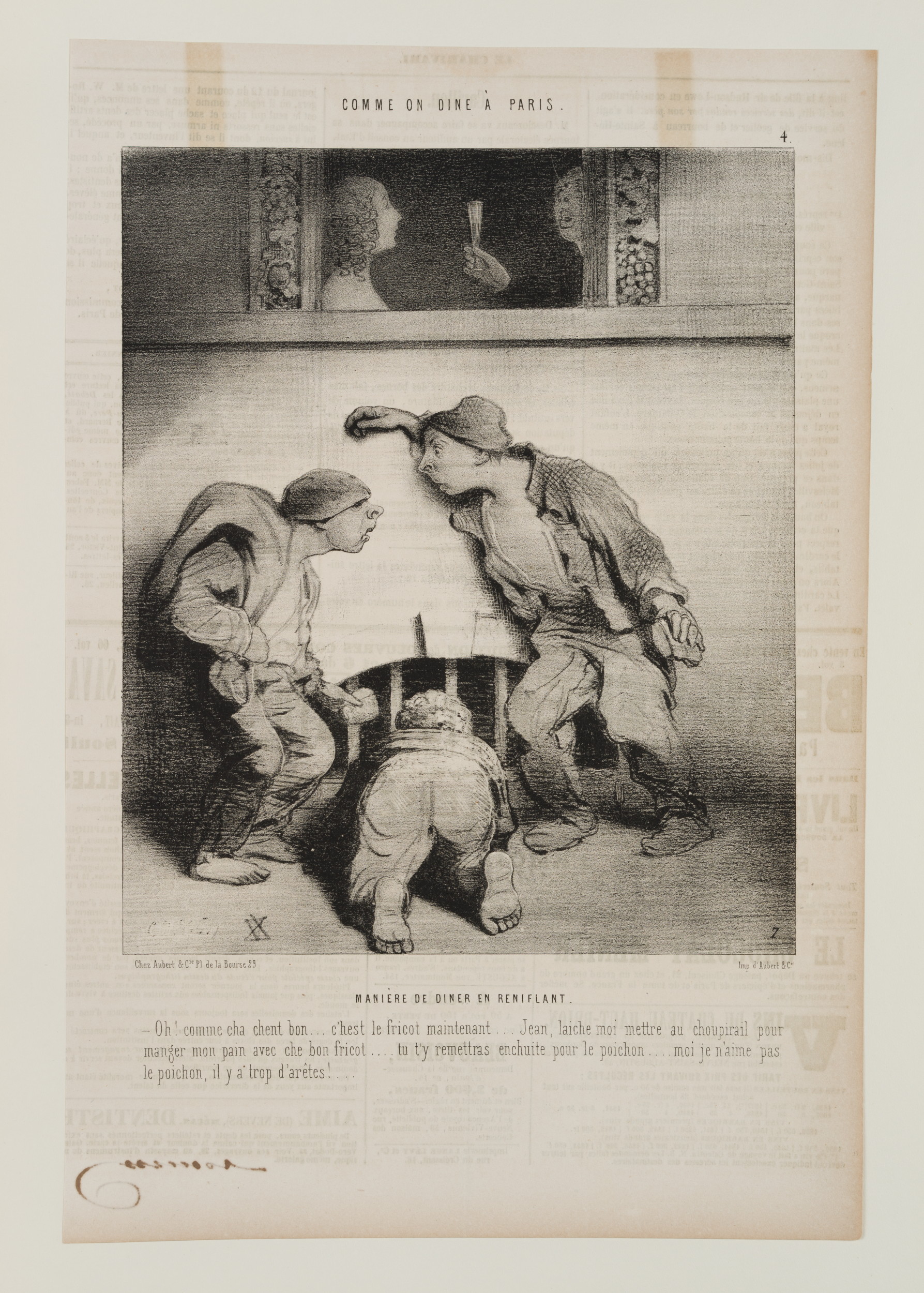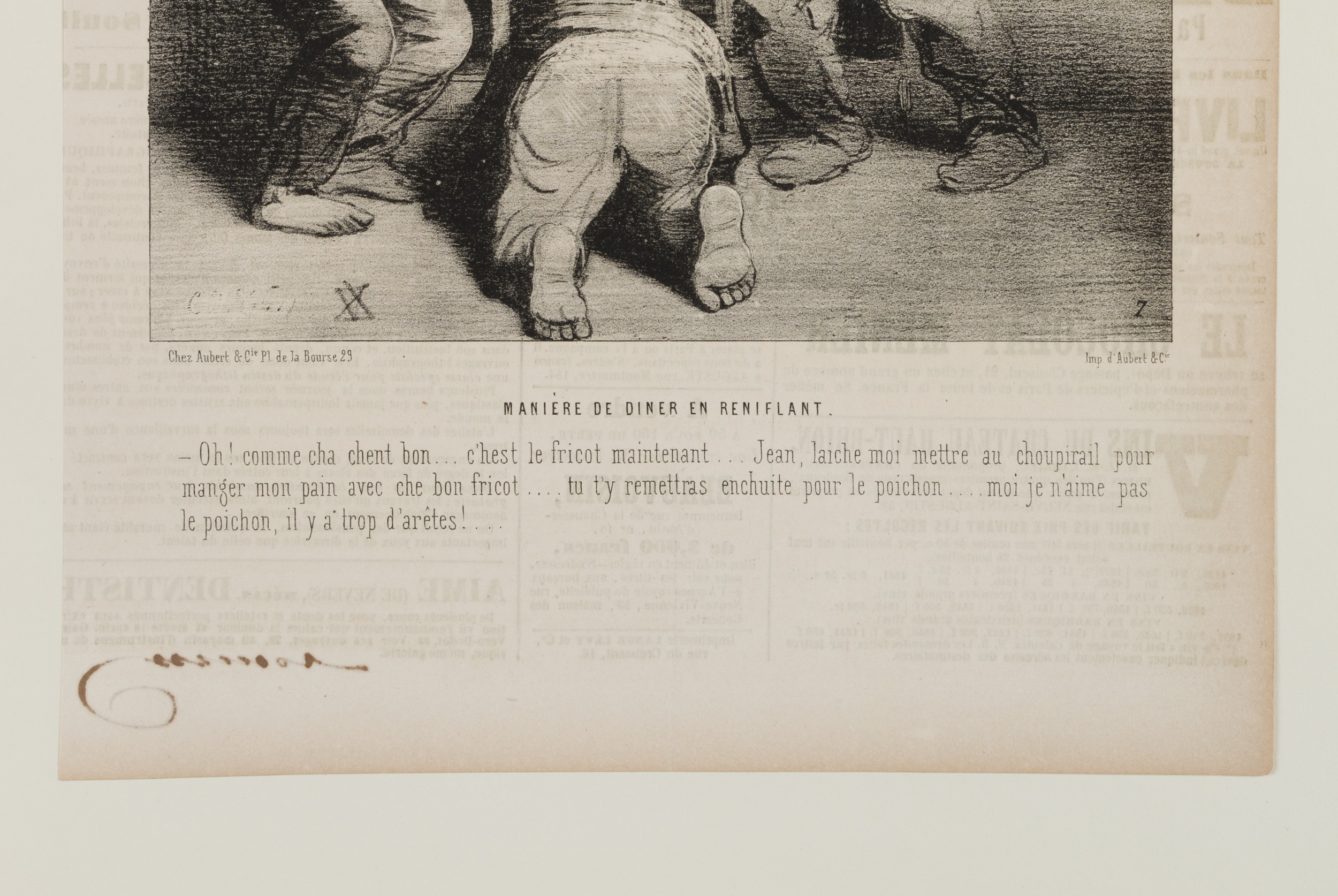 Caption. Translated from French: “MANIERE DE DINER EN RENIFLANT. – Oh! how good that smells….here’s the twine….Jean, I got it into my head to eat my bread with good vegetables…..get to work, but don’t fish peas….I don’t like peas, they have too many bones!” - Verso: Typographic printing, advertisements, signature by another hand
