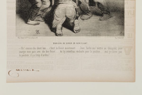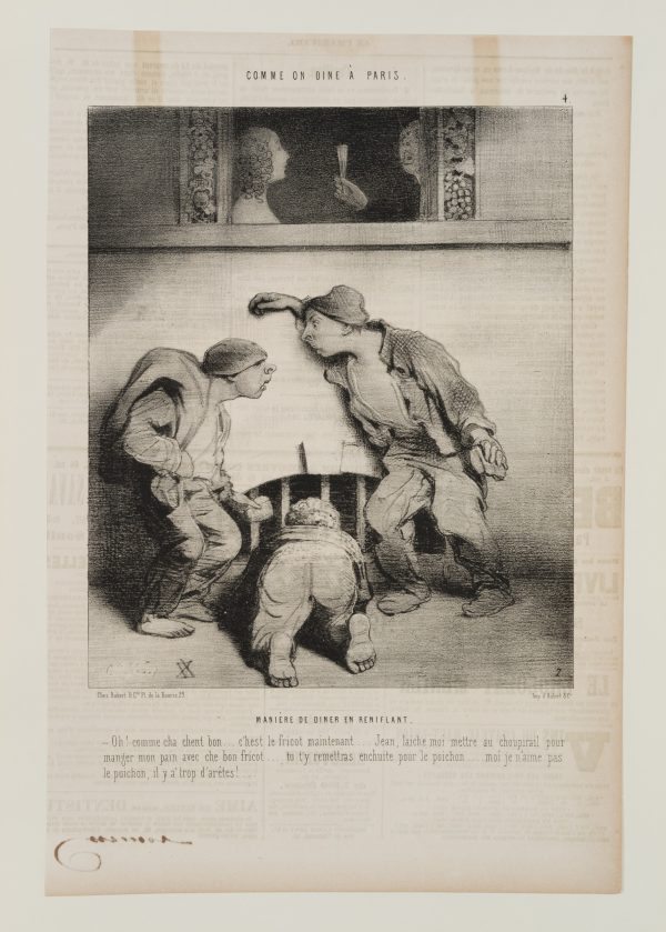 Bildunterschrift. Aus dem Französischen übersetzt: “MANIERE DE DINER EN RENIFLANT. – Oh! wie gut das riecht….hier ist der Bindfaden….Jean, ich habe mir in den Kopf gesetzt, mein Brot mit gutem Gemüse zu essen…..mach dich an die Arbeit, aber angel keine Erbsen….Ich mag keine Erbsen, die haben zu viele Gräten!” - Verso: Typographischer Druck, Werbeanzeigen, Signatur von fremder Hand