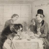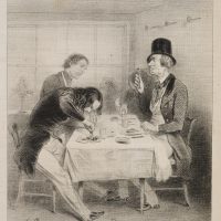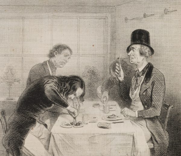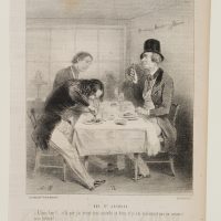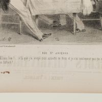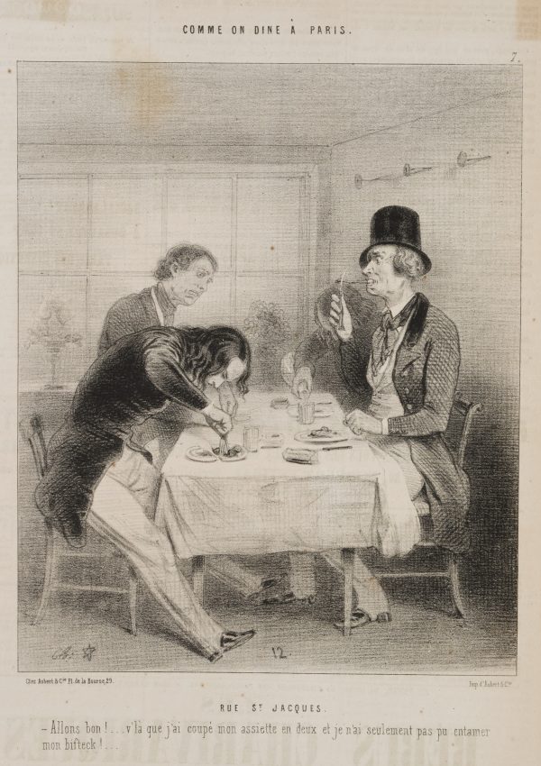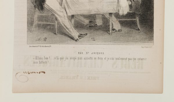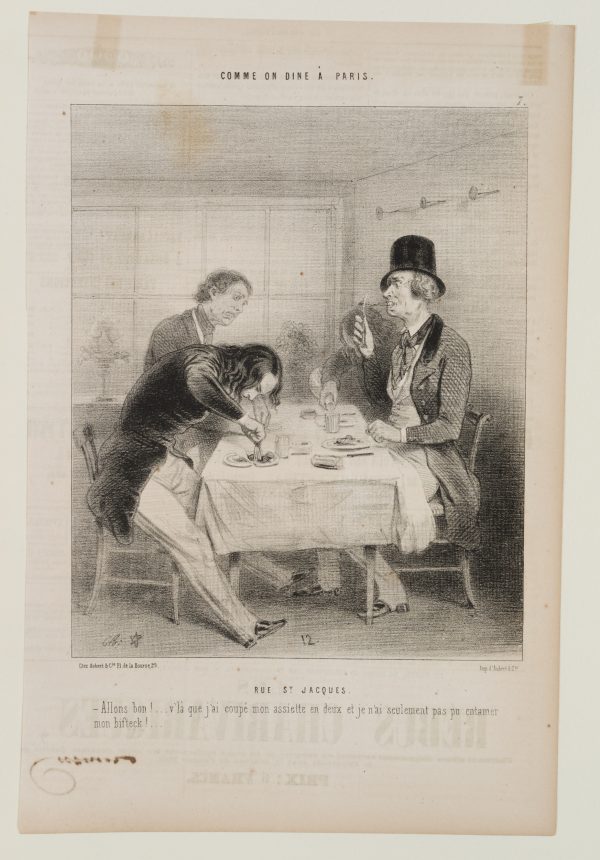 Caption. Translated from the French: “RUE ST. JACQUES. That’s it! …Here you go…I couldn’t cut my steak, but I could cut my plate!…” - Verso: Typographic printing, advertisements, signature by another hand