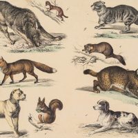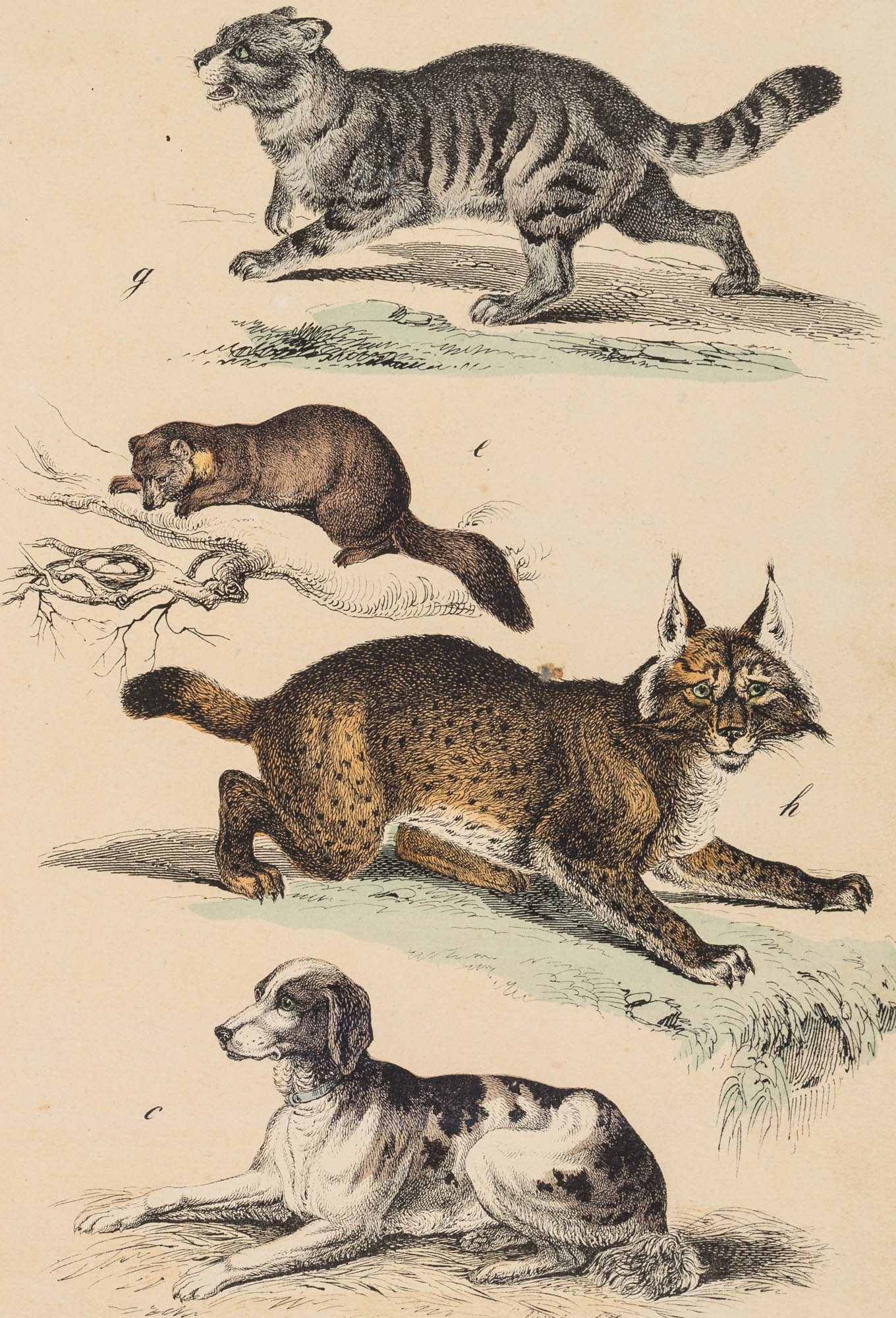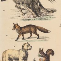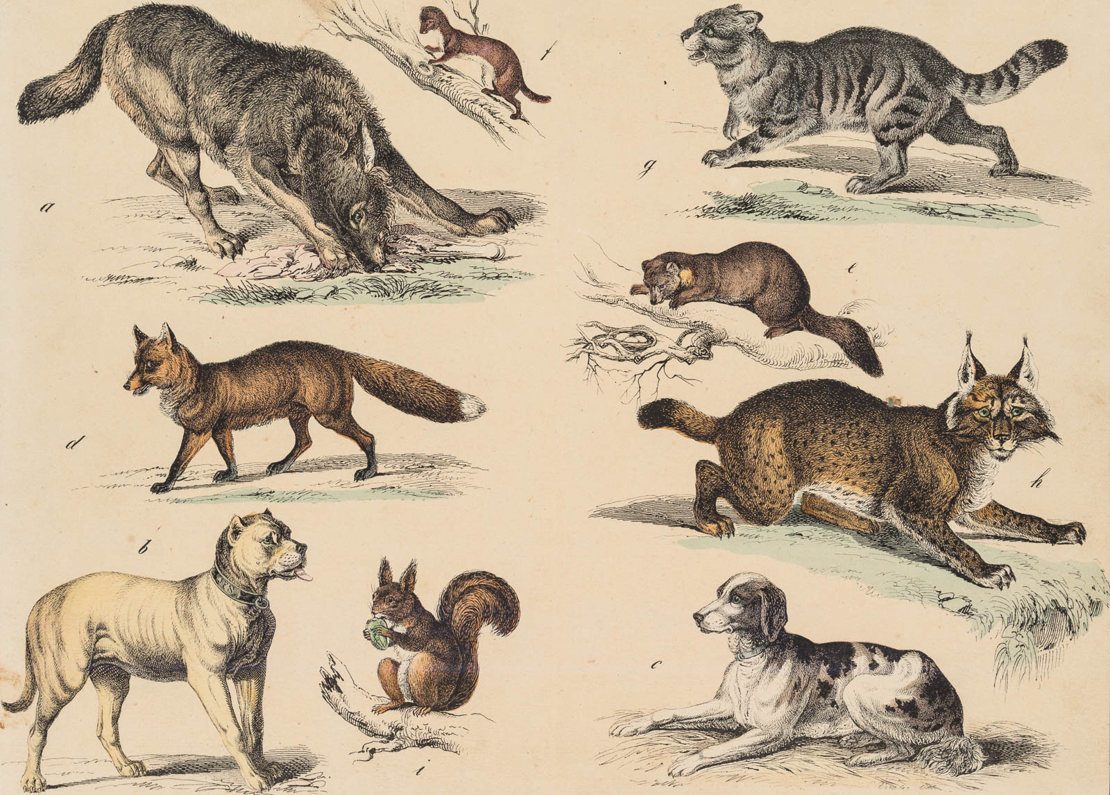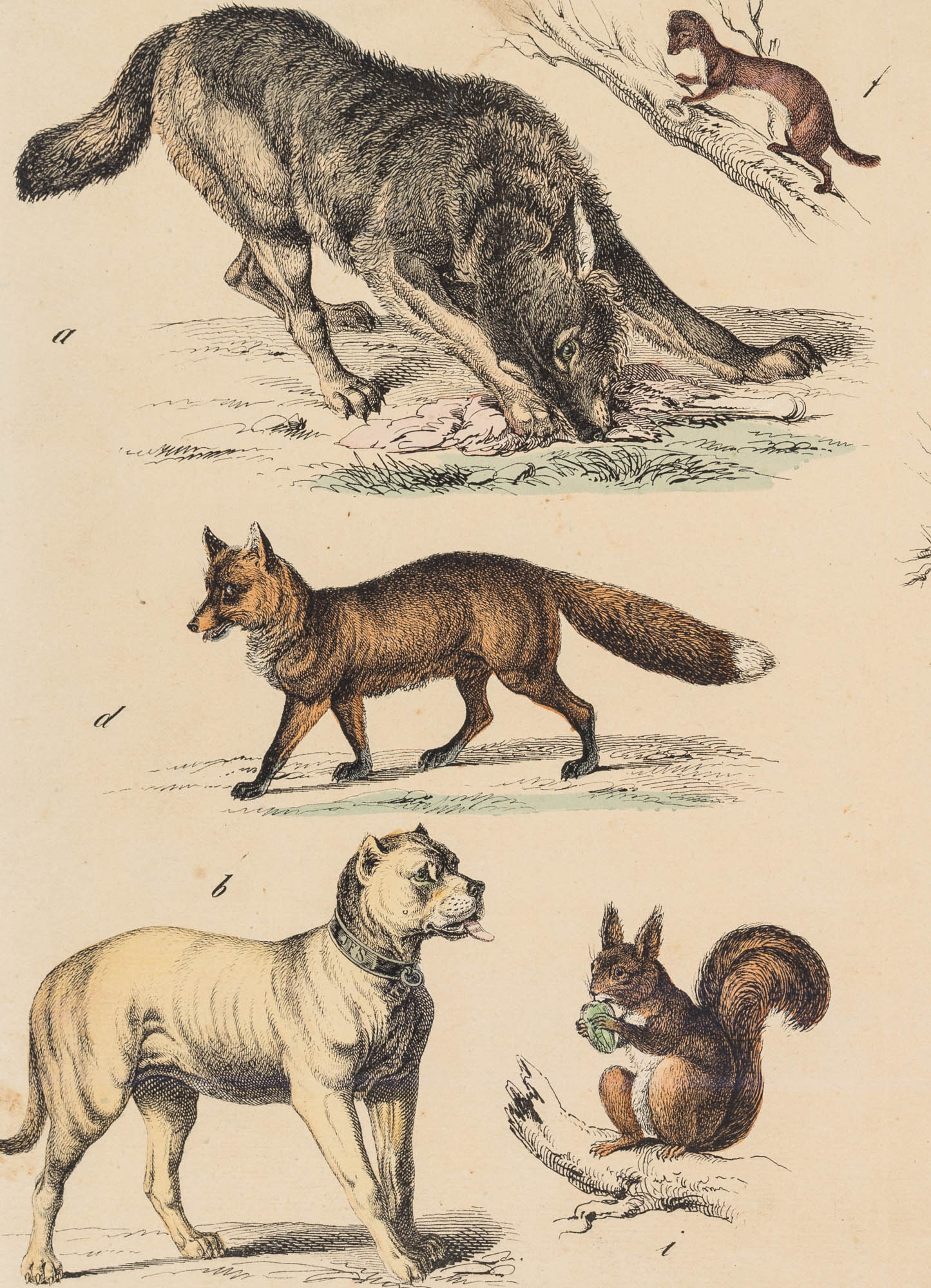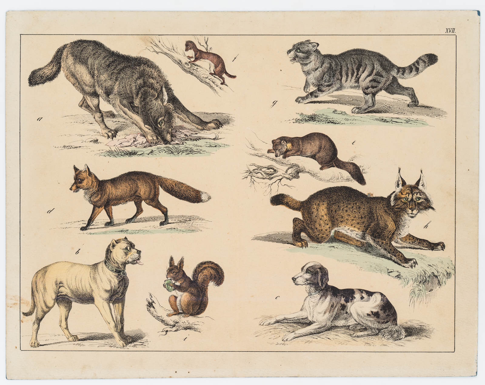 Christian Votteler (um 1871 – um 1914 ), Tierdarstellung verschiedener Nagetiere: Wolf, Katze, Eichhörnchen, Hund, Fuchs etc. Aus einer Tierenzyklopädie, 1870, Lithographie