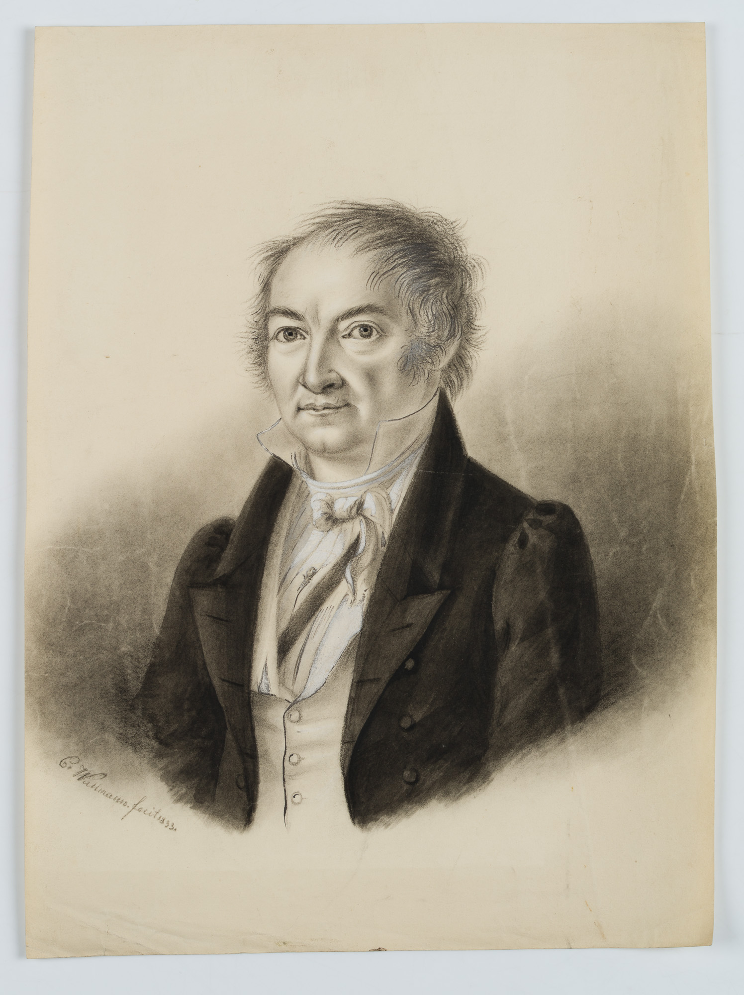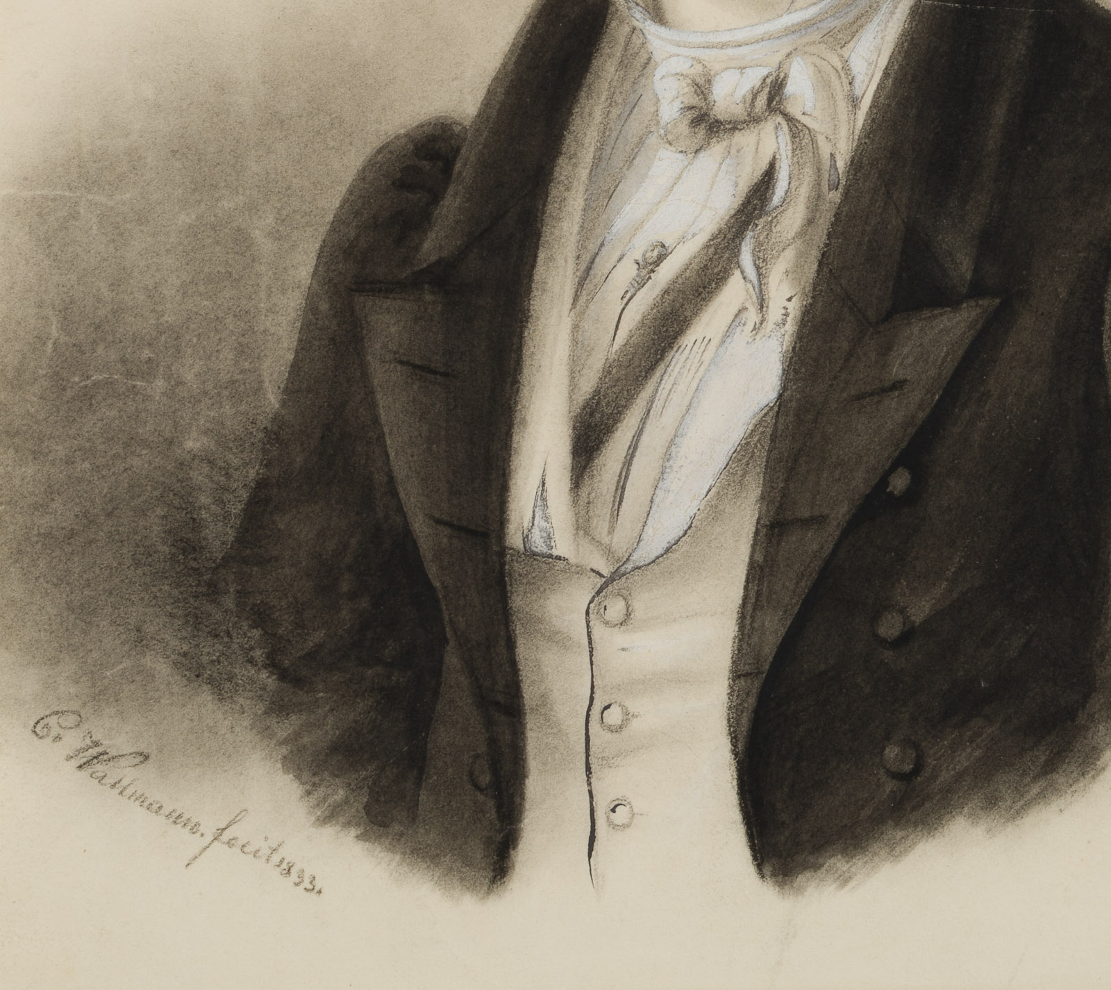 - Beschreibung: Gekonnt ausgeführte Porträtzeichnung in Kohel mit Weißhöhung. Literarisch greifbar ist ein Jacob Waltmann, der 1802 in Wien geboren wurde dort auch 1871 starb, hauptsächlich aber Landschaften malte. Ob es sich hier um den gleichen Künstler handelt, muss vorerst offen bleiben. | Wasserzeichen: “J Whatmann….”