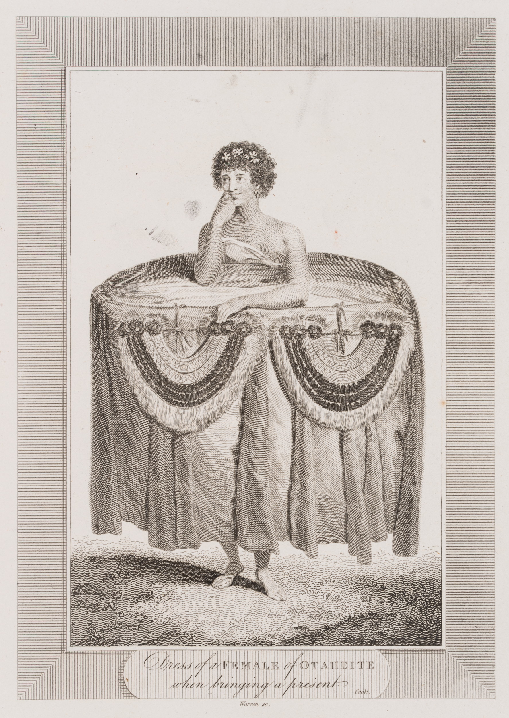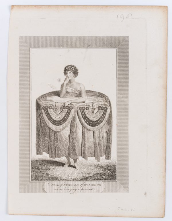 - Description: Ethnographic depiction of a woman in Tahiti in traditional costume for the presentation of a gift. Probably from a record by James Cook of his voyage to the South Pacific in 1769.