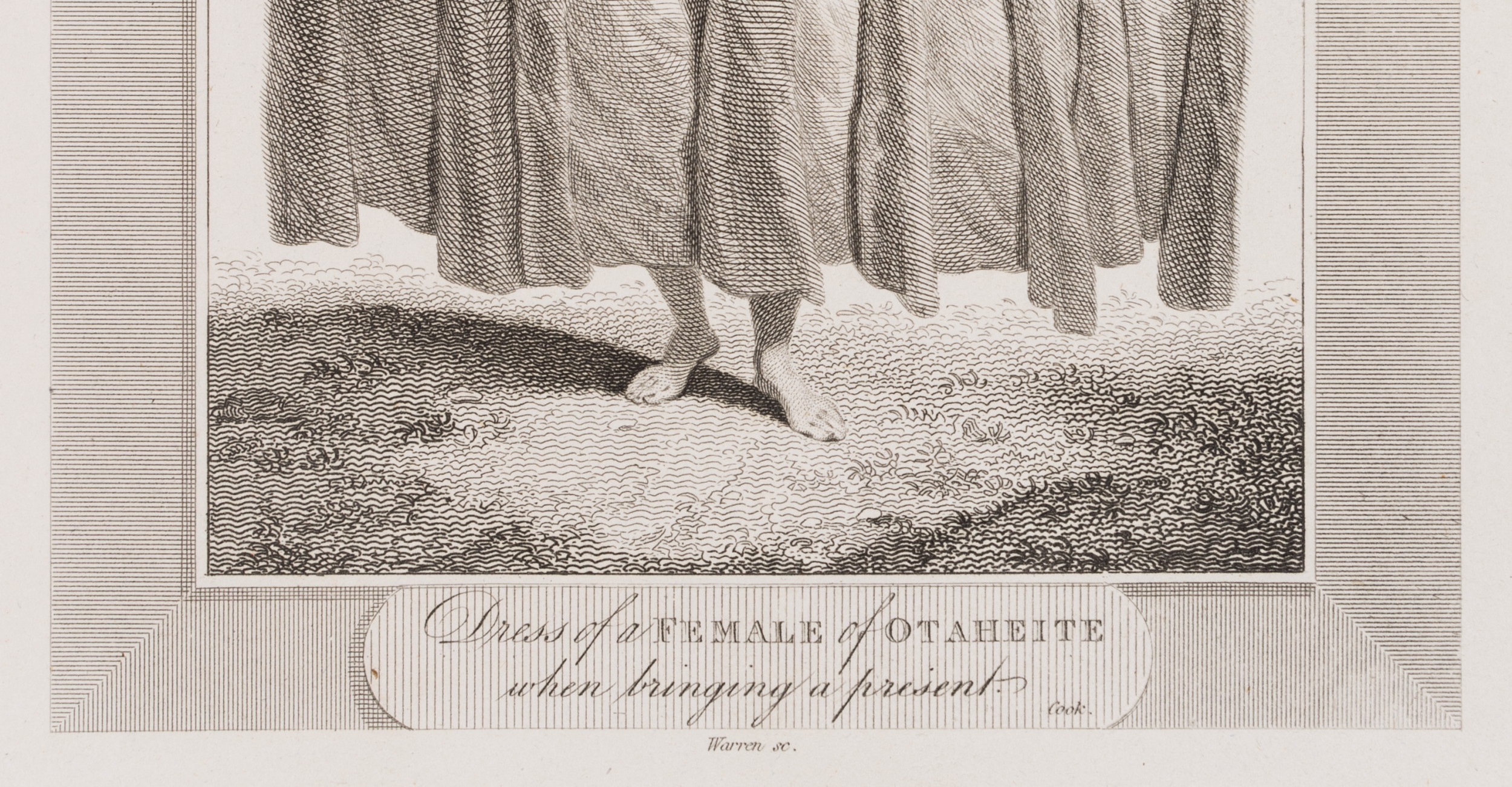 - Bezeichnung: Unten mittig im Druck signiert: “Warren sc.”. Unten im Druck bezeichnet: “Dress of a Female of Otaheite when bringing a present. Cook”.