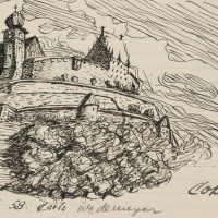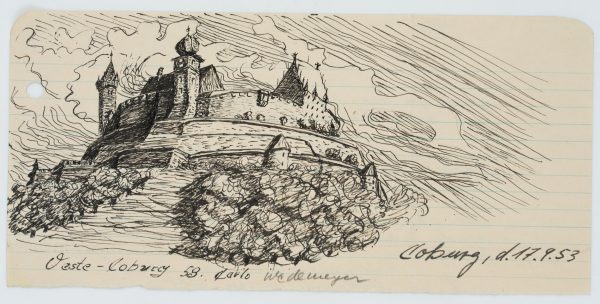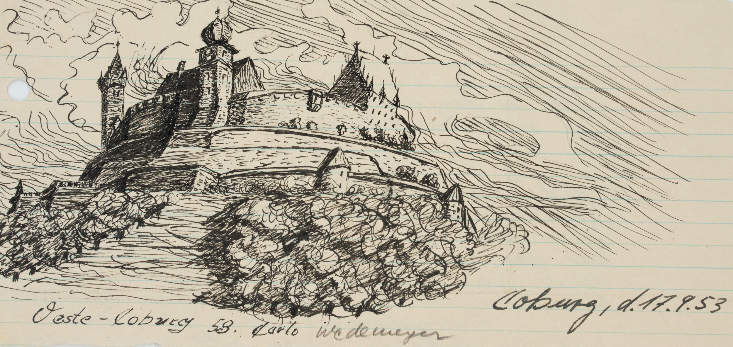 - Bezeichnung: Unten mittig signiert: “Carlo Wedemeyer”. Unten rechts datiert: “Coburg, d. 17.9.53”. Unten links eigenhändig bezeichnet: “Veste-Coburg 53”. Verso weitere Beschriftungen: “[Fragment eines Briefes]”.