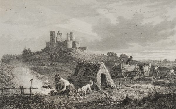 James Carter (1798 London – 1855 ibid.) after Ludwig Richter (1803 Dresden – 1884 ibid.), Stolpen View over the meadows with farmers and farm workers at Stolpen Castle, Saxony, c. 1837, Steel engraving