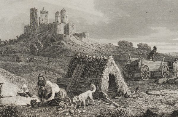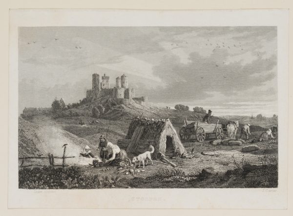 James Carter (1798 London – 1855 ebd.) nach Ludwig Richter (1803 Dresden – 1884 ebd.), Stolpen. Blick über die Wiesen mit Bauern und Landarbeitern auf Burg Stolpen, Sachsen, um 1837, Stahlstich