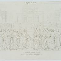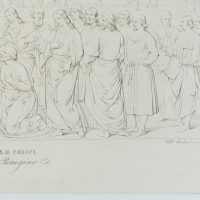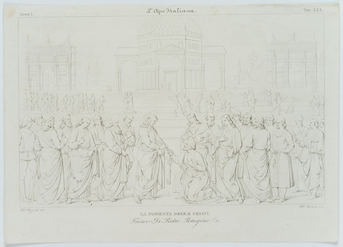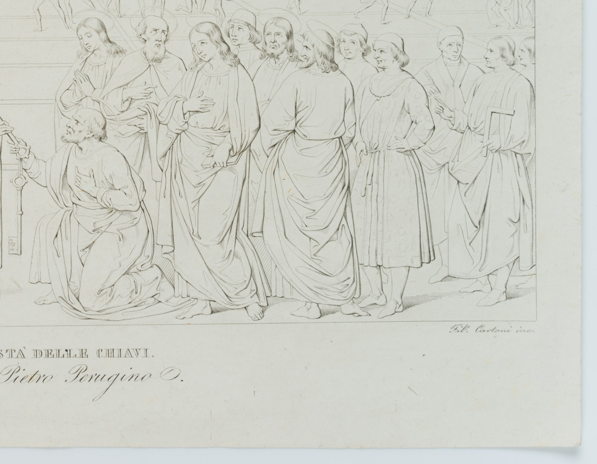 - Description: This very beautiful print shows Jesus handing over the keys to Peter after Perugino’s well-known fresco in the Sistine Chapel. The strong depth effect that Perugino’s contemporaries admired in this work is also clear in the engraving. Filippo Cartoni (active around 1830/1838) was an Italian engraver.