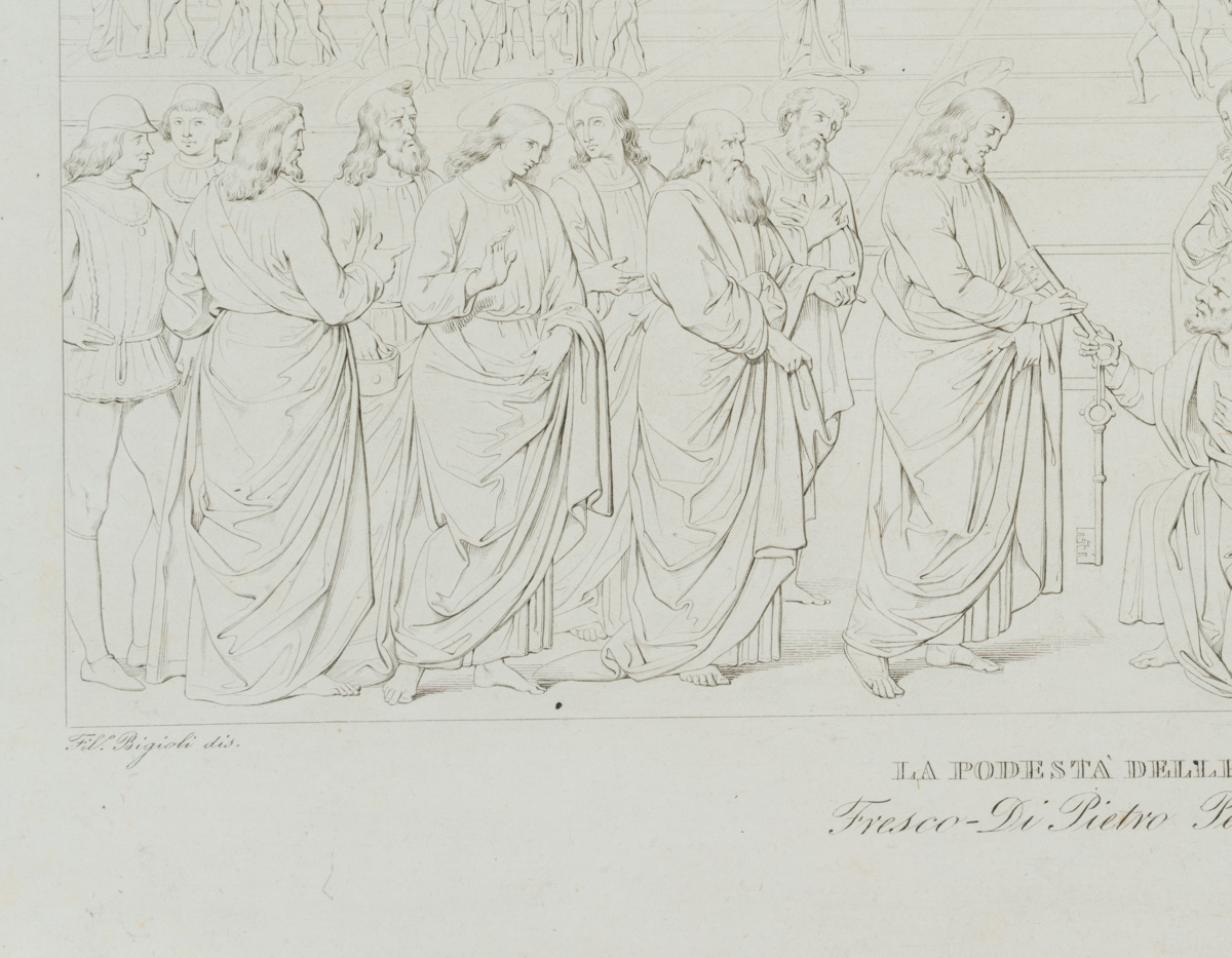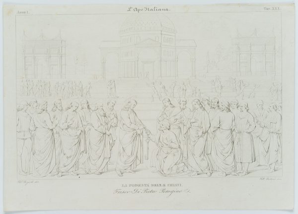 - Bezeichnung: bezeichnet oben: “Anno I. L`Ape italiana Tav. XXX.”, bezeichnet unten: “Fil. Bigioli dis. Fil. Cartoni inc. La podestà delle chiavi. Fresco – Di Pietro Perugino”