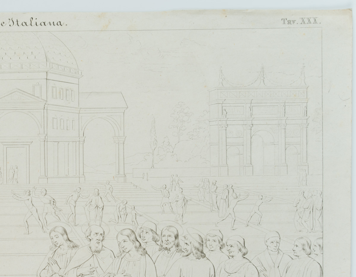 - Inscription: bezeichnet oben: “Anno I. L`Ape italiana Tav. XXX.”, bezeichnet unten: “Fil. Bigioli dis. Fil. Cartoni inc. La podestà delle chiavi. Fresco – By Pietro Perugino”.