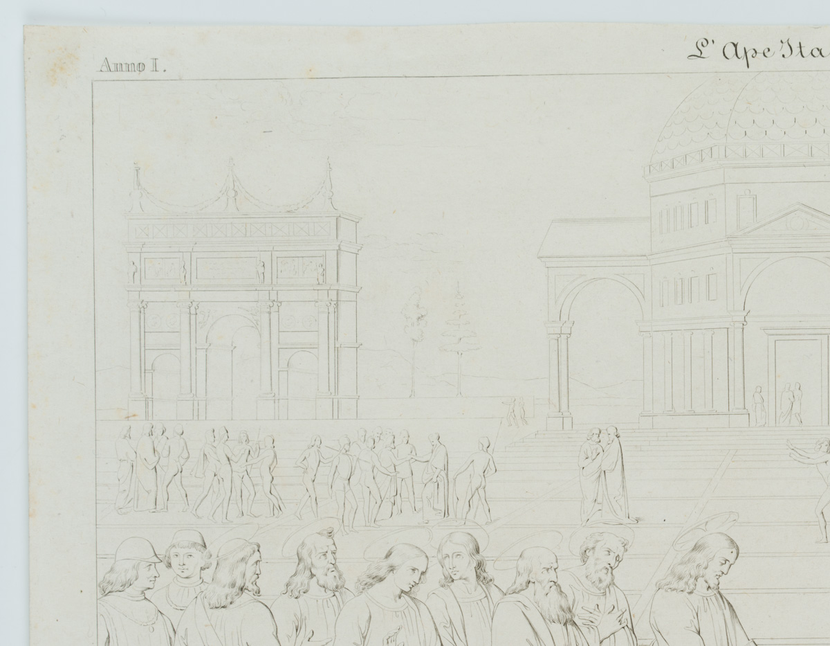 - Beschreibung: Dieses sehr schöne Blatt zeigt die Schlüsselübergabe Jesu an Petrus nach Peruginos bekanntem Fresko in der Sixtinischen Kapelle. Auch im Kupferstich ist die starke Tiefenwirkung deutlich, die Peruginos Zeitgenossen an diesem Werk bewunderten. Filippo Cartoni (tätig um 1830/1838) war italienischer Kupferstecher.