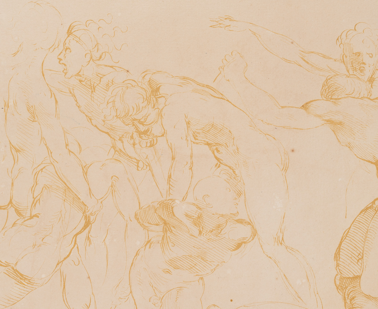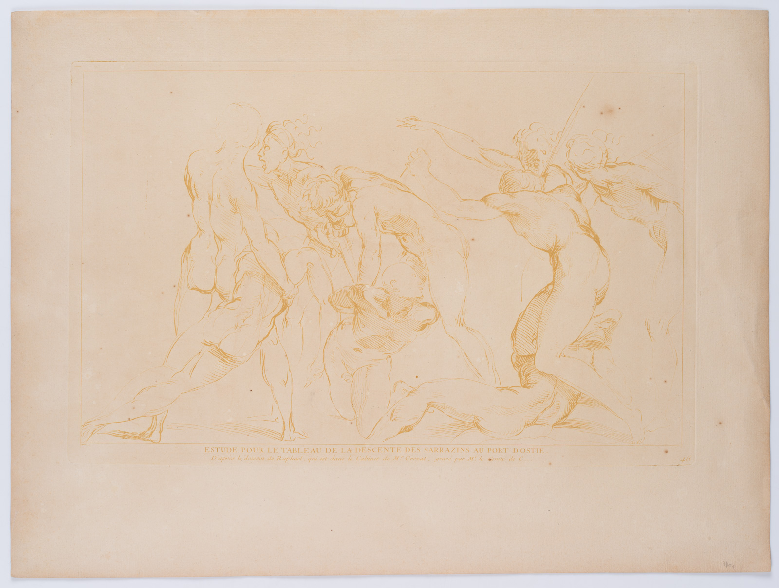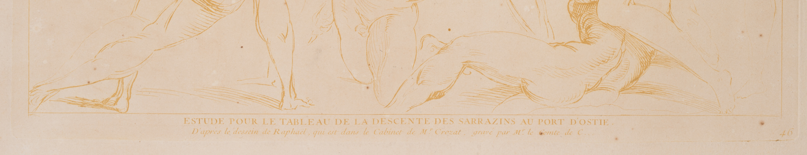 - Bezeichnung: Unten in der Druckplatte betitelt und signiert: “Estude pour de Tableau de la Descente des Sarrazins au Port d’Ostie”. Studie zum Fresko in den Stanzen des Vatikans in der Stanza dell’incendio di Borgo (Saal des Borgobrandes) von Raffael. Aus einer Serie von Radierungen nach Zeichnungen Raffaels. Verso Datumsstempel: “20 Juli 1901”.
