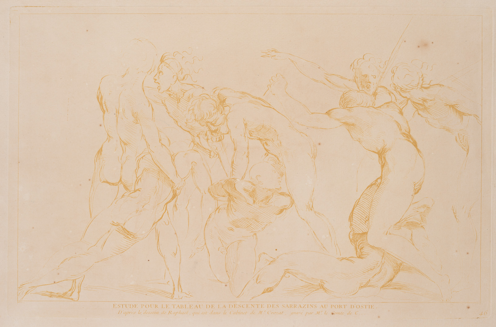 Anne Claude Philippe de Caylus (1692 Paris – 1765 ebd.) nach Raffael: Raffaello Sanzio da Urbino (1483 Urbino – 1520 Rom), Rückzug der Sarazenen, Ostia, 18. Jahrhundert, Radierung