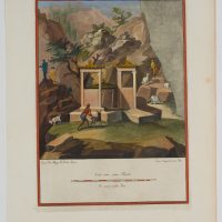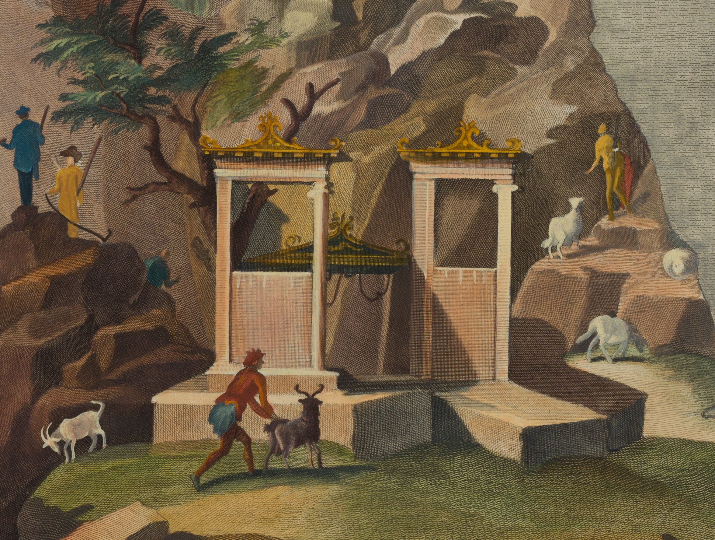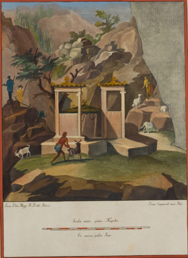 Francesco Cepparuli (vor 1750 – nach 1767 ) nach Giovanni Elia Morghen (1717 Florenz – nach 1790 ), Hirten in felsiger Landschaft mit Architekturelementen. Nach pompejanischen Fresken, 18. Jahrhundert, Kupferstich