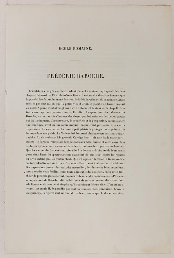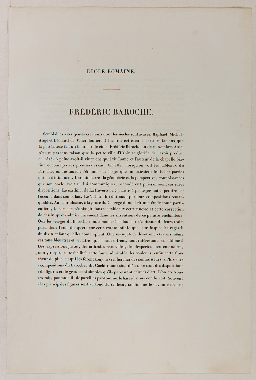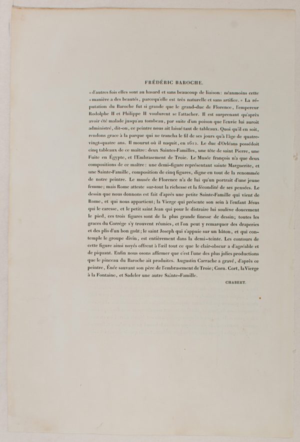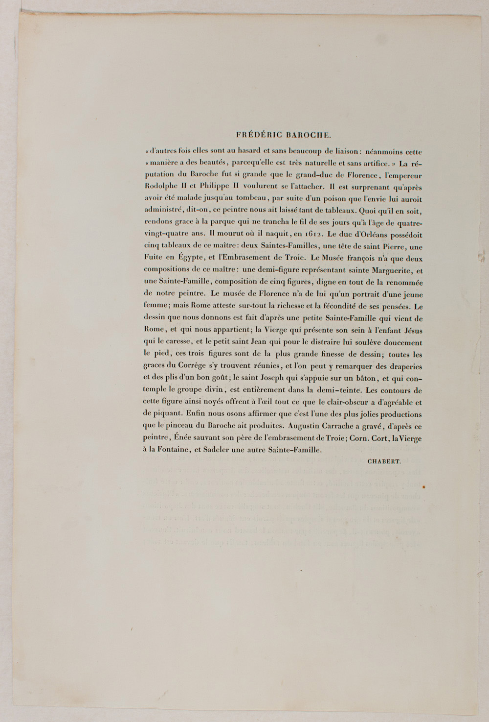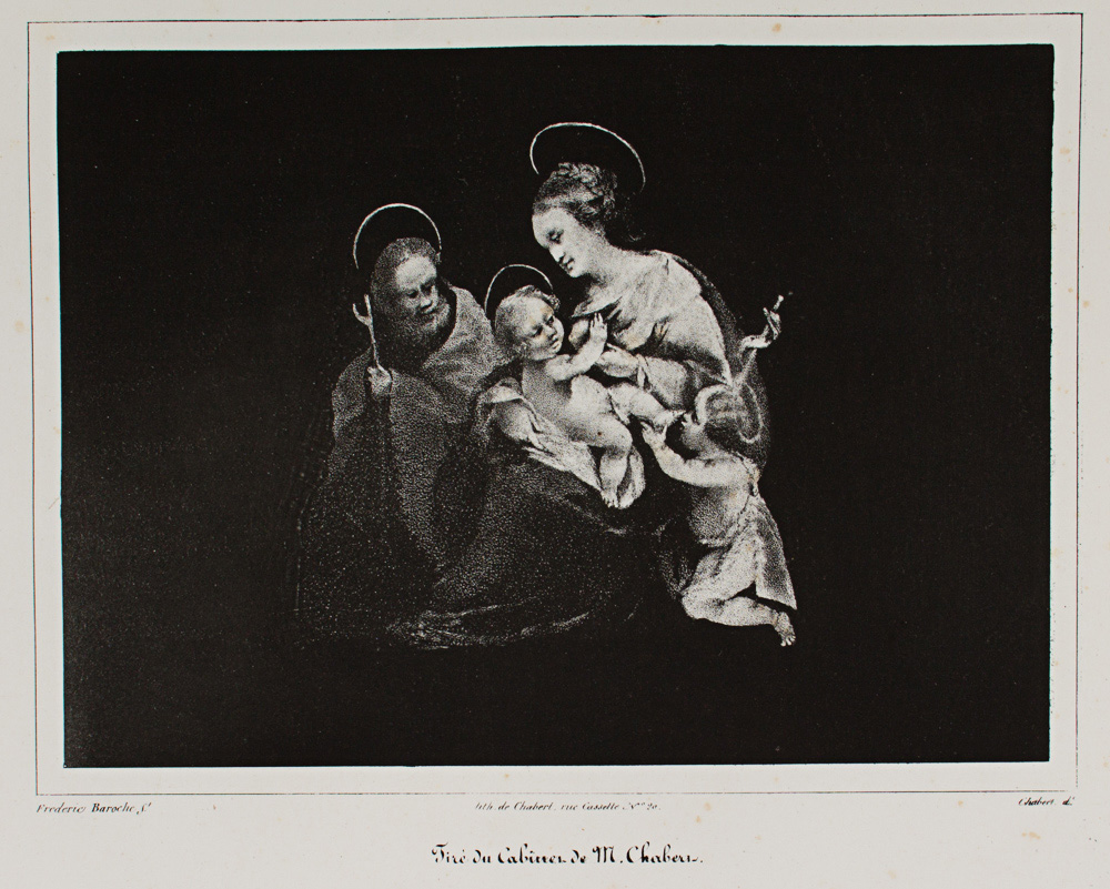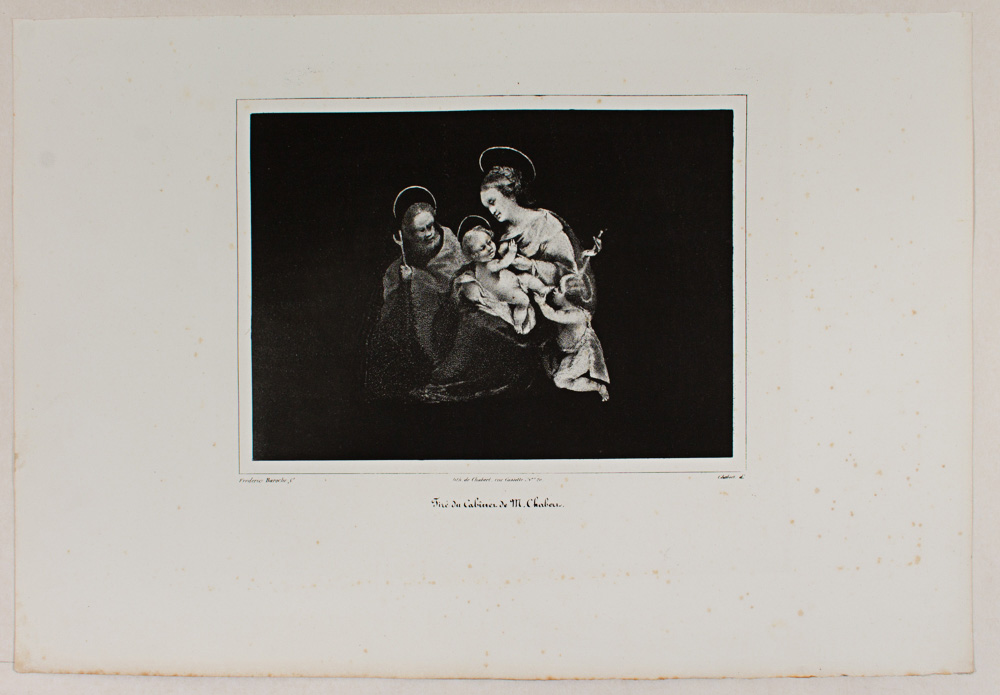 - Description: Virgin Mary with Saints” Lithograph of a work by Frederic Baroche (1528 1612). From the series: Pictures of the Romanesque School. Inscribed: Frederic Baroche f Lith. de Chabert, rue Cassette N. 20. Chabert d Tire du Cabines de M. Chabert. Separate text information (In French by Chabert) in the format of the art sheet.