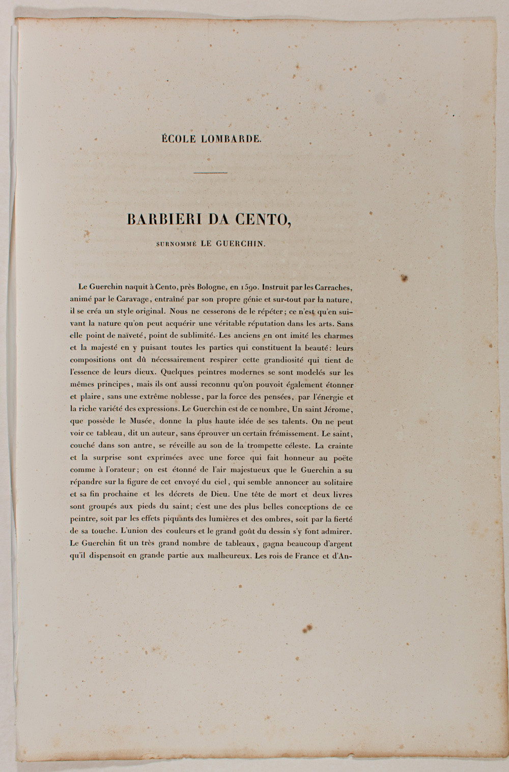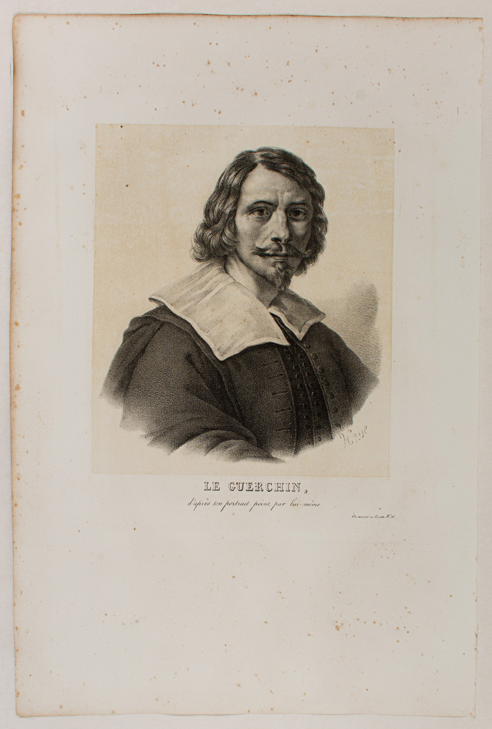 • Description: Portrait of the painter Barbieri da Cento, le Guerchin (1590-1667). He was a painter of the Lombard school. Colour lithograph. From the series: Pictures of the Italian School (ECOLES D’ITALIE). Signed: Hesse. Title: LE GUERCHIN d’apres son portrait peint par lui-meme. Separate text sheet (In French, by Chabert.