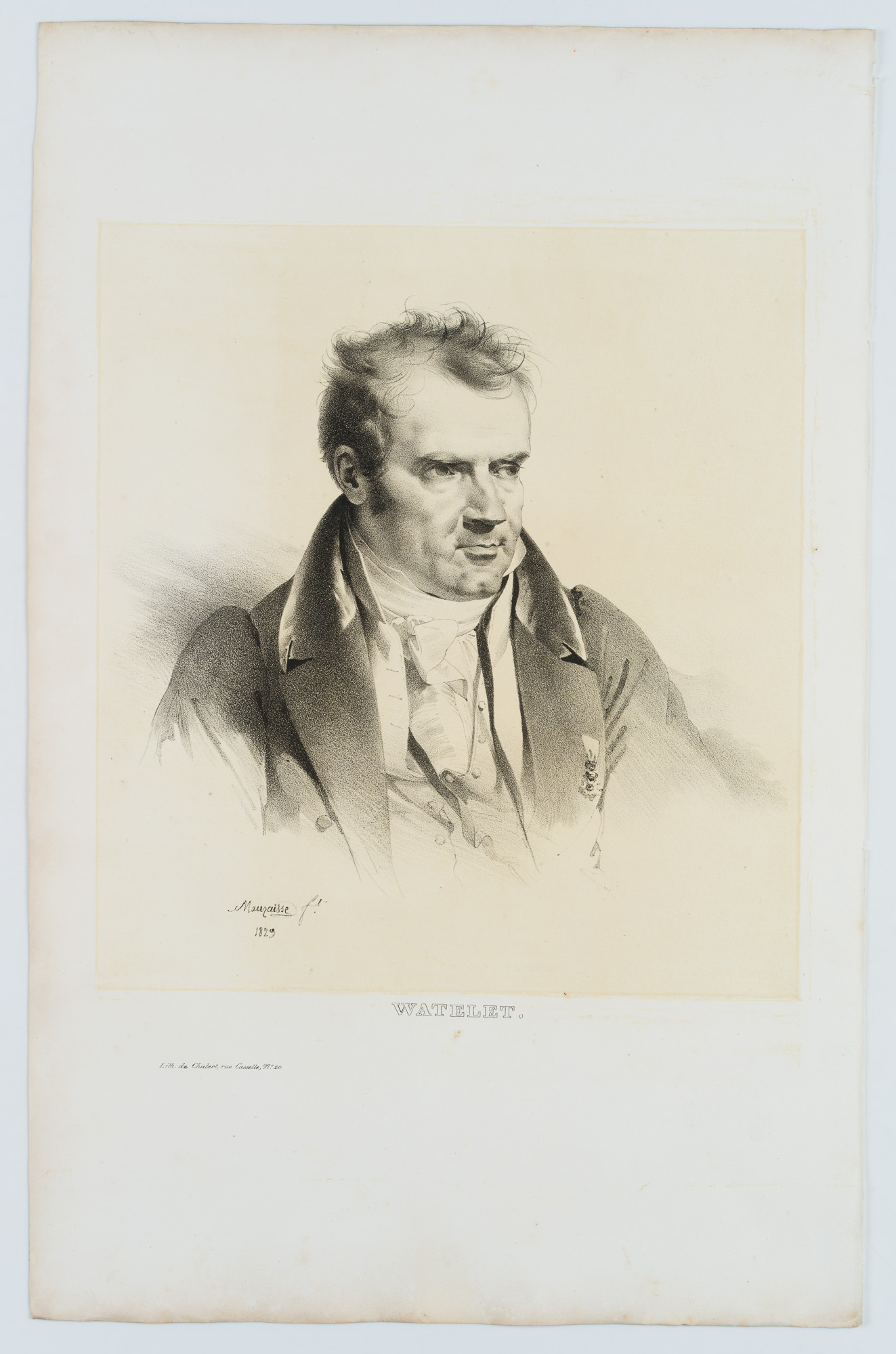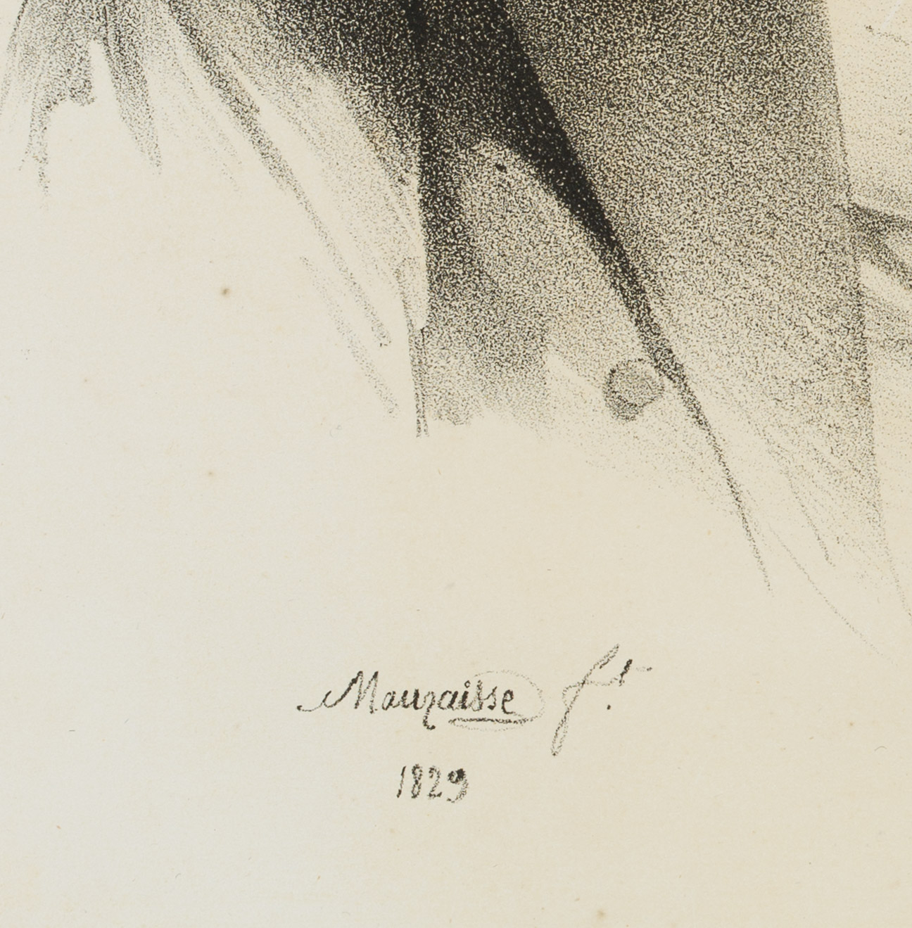 - Bezeichnung: Unten links im Druck signiert: “Lith. de Chabert”. Links unten in der Darstellung ist die Künstlersignatur und Datierung zu sehen “Mauraisse / 1829”, unter der Darstellung betitelt und bezeichnet: “Lith. De Chabert, rue Casselle, No.20”.