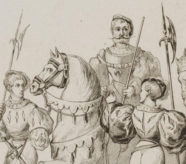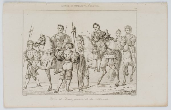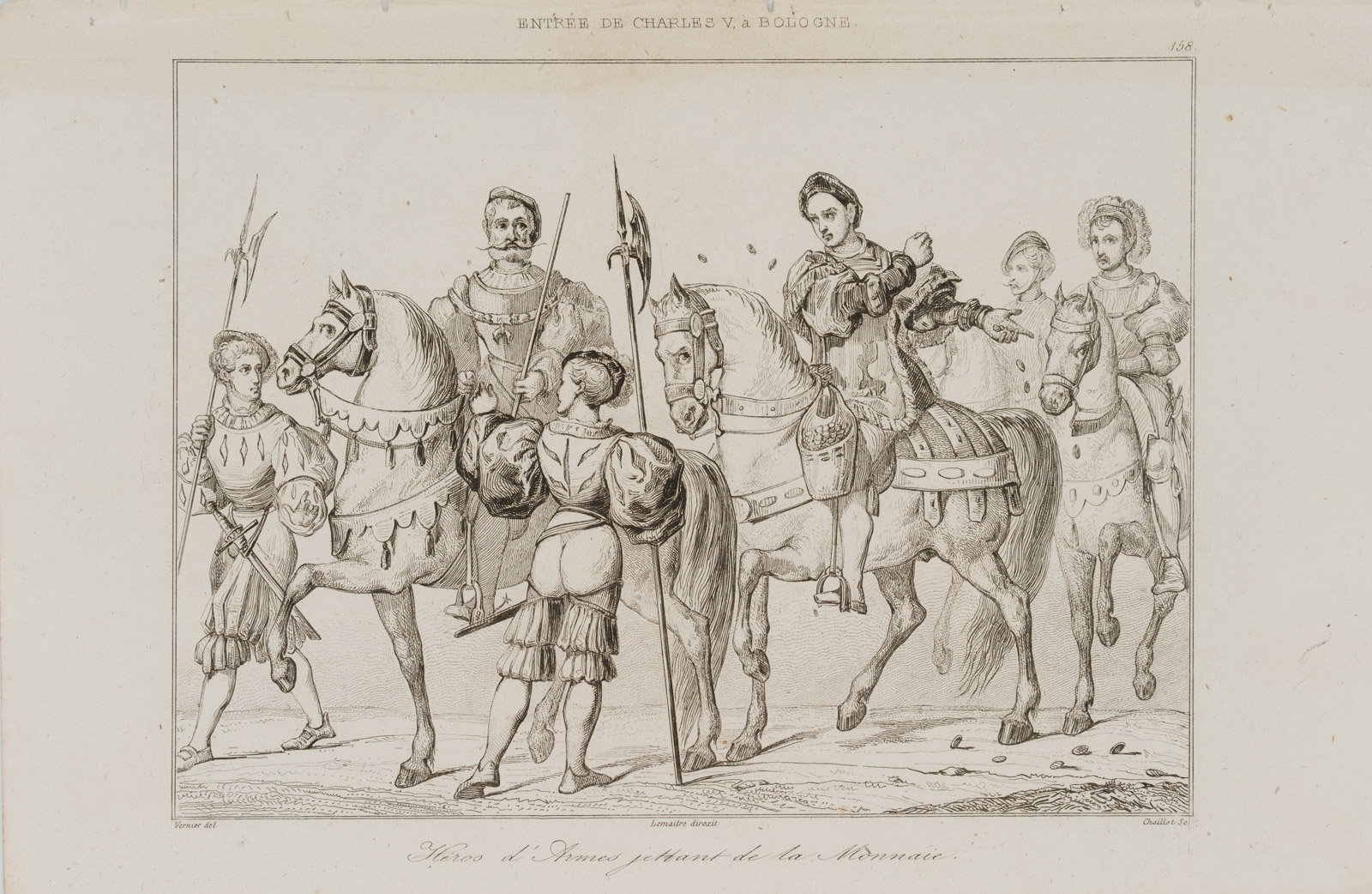 - Beschreibung: Unter der Darstellung betitelt und oben bezeichnet “Entrée de Charles V. a Bologne” sowie nummeriert “158”. Unter der Darstellung signiert “Vernier del. / Lemaitre direxit / Chaillot sc.”.