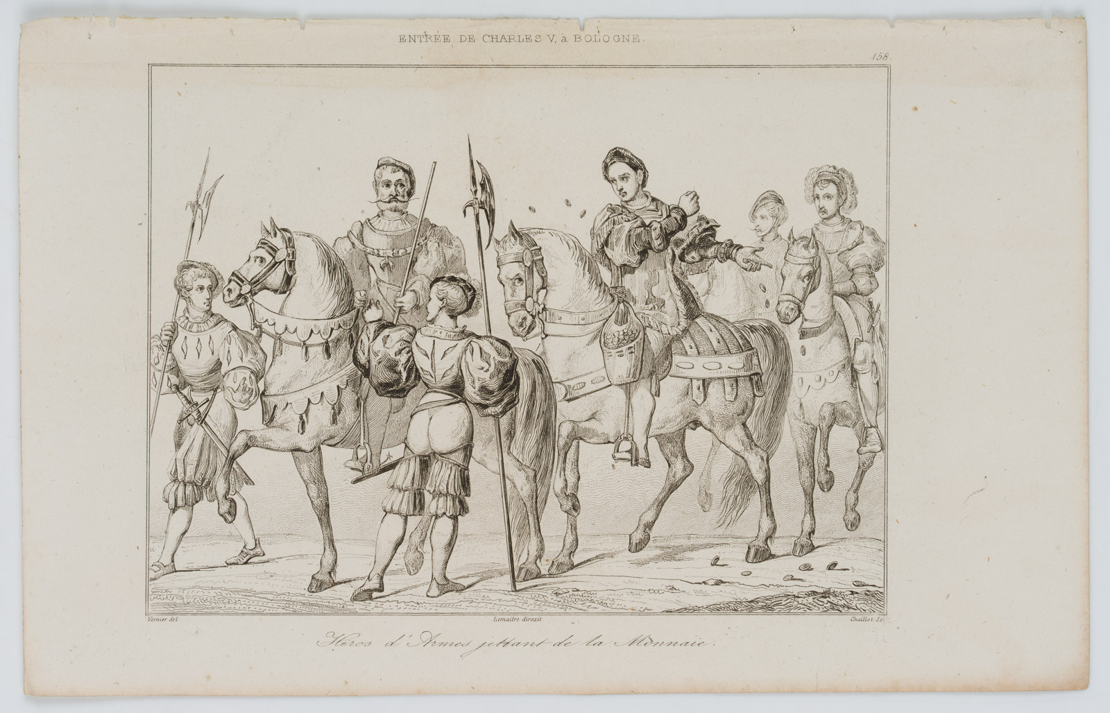 - Description: Titled below the depiction and inscribed at the top “Entrée de Charles V. a Bologne” and numbered “158”. Signed “Vernier del. / Lemaitre direxit / Chaillot sc.” below the depiction.