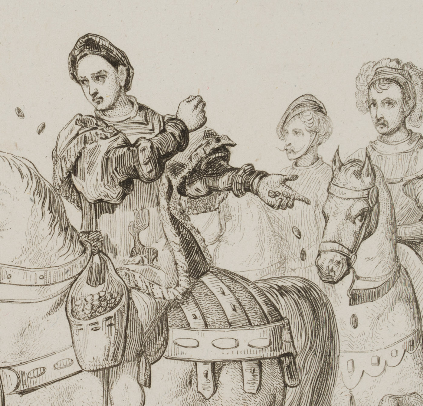 Chaillot (19. Jahrhundert) nach Vernier (19. Jahrhundert), Héros d’Armes jettant de la Monnaie, 19. Jahrhundert, Kupferstich