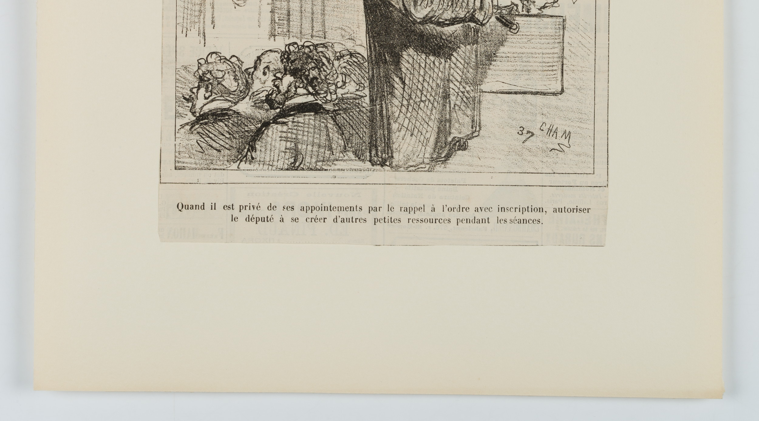 Bildunterschrift. Aus dem Französischen übersetzt: “Wenn der Abgeordnete durch einen Ordnungsruf mit Unterlassungsanspruch um seine Bezüge gebracht wird, soll er sich während der Sitzungen weitere kleine Einkünfte verschaffen dürfen.” - Verso: Typographischer Druck, Werbeanzeigen