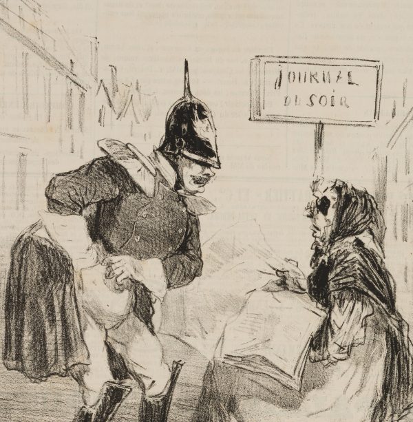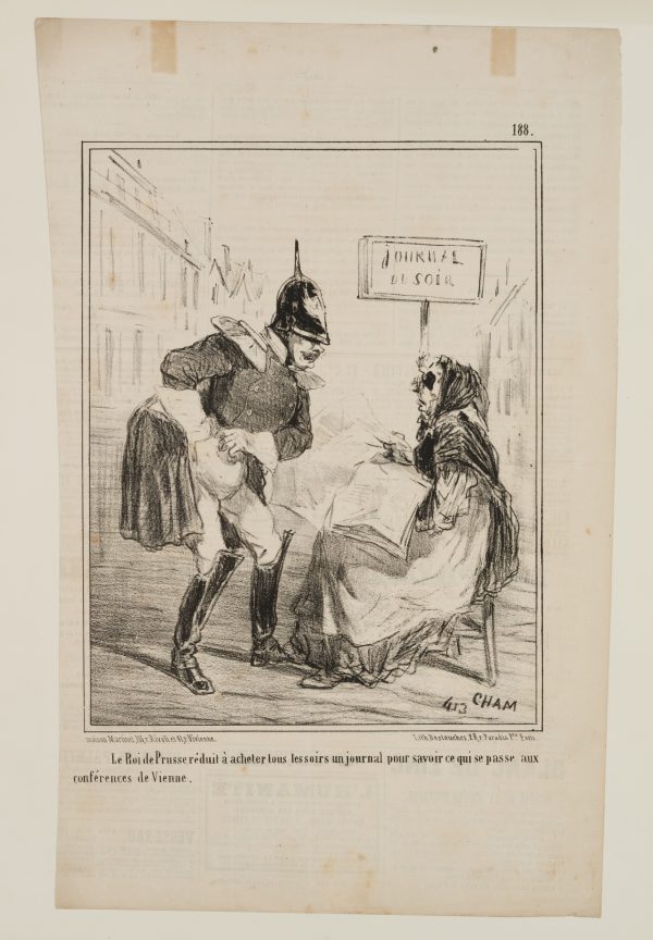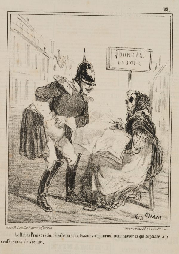 • Description: Caption. Translated from the French: “The King of Prussia is anxious to buy a newspaper every evening to find out what is happening at the Congress of Vienna.”