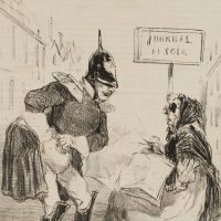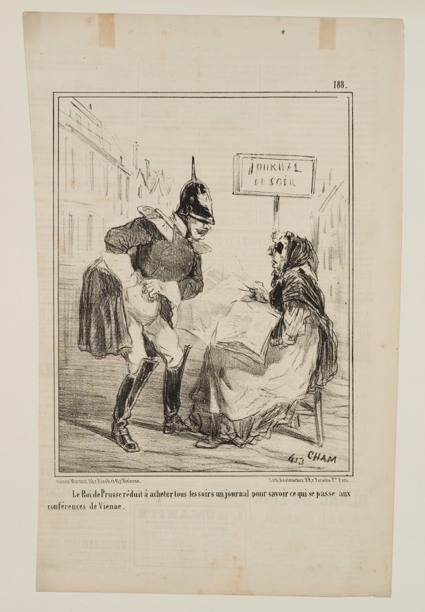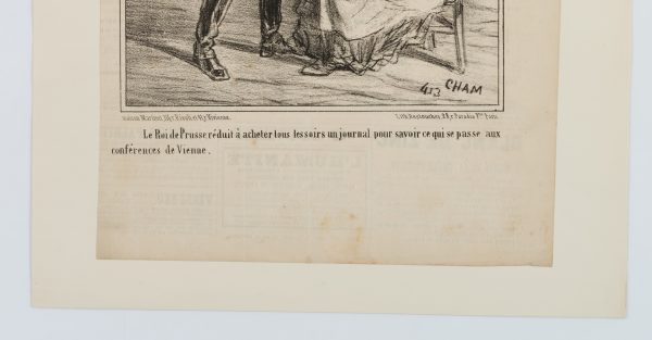 Cham: Amédée Charles Henry de Noé (1819 Paris – 1879 ibid.), Caricature King of Prussia buying a newspaper, , Lithography
