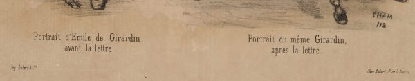 Caption. Translated from the French: “[1] Portrait of Emile de Girardin before the letter [2]Portrait of the same Girardin after the letter.” - Verso: Typographic printing, advertisements