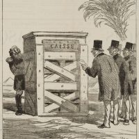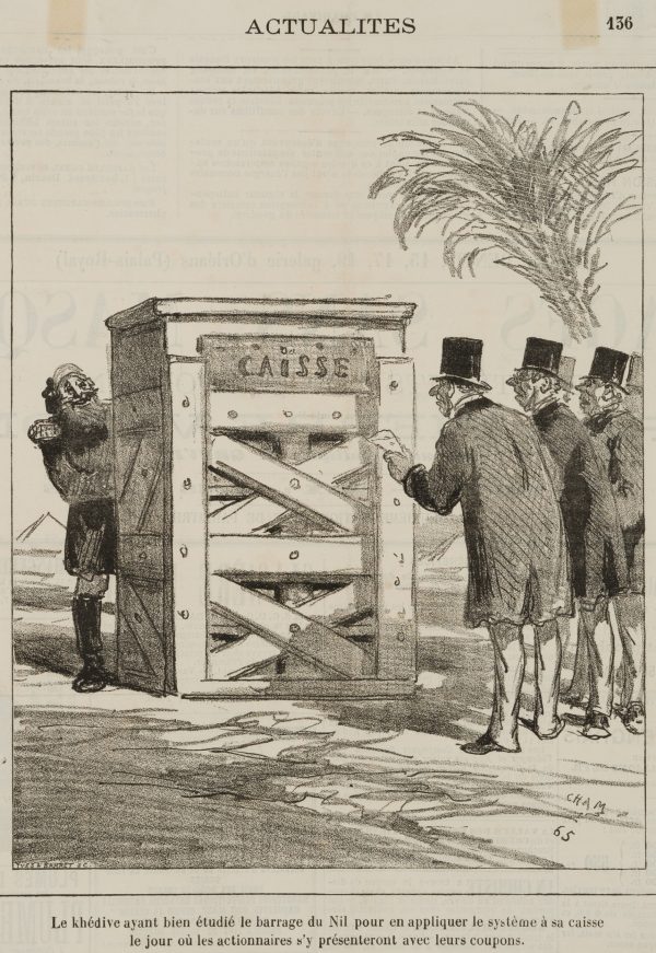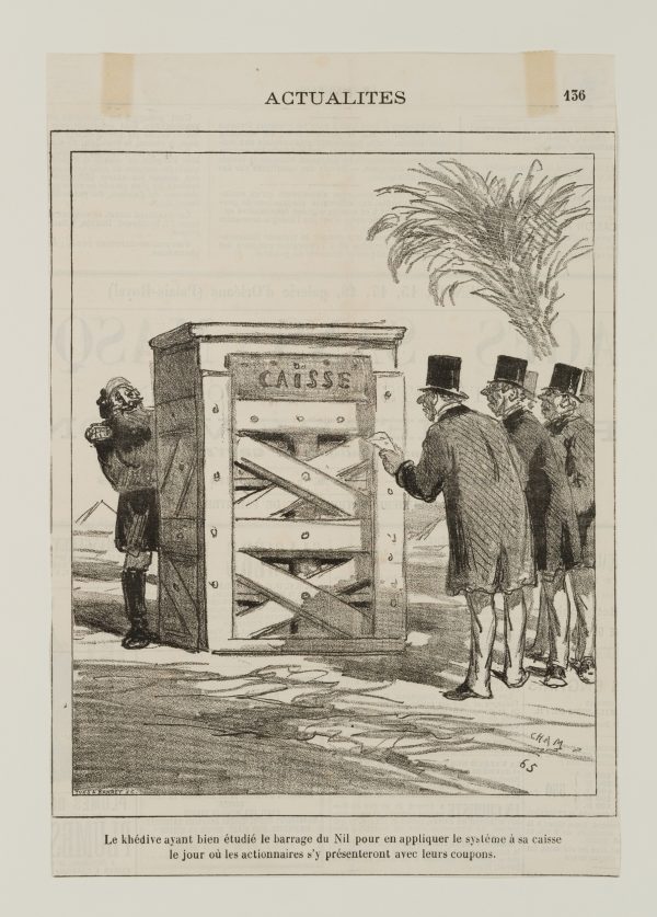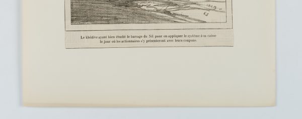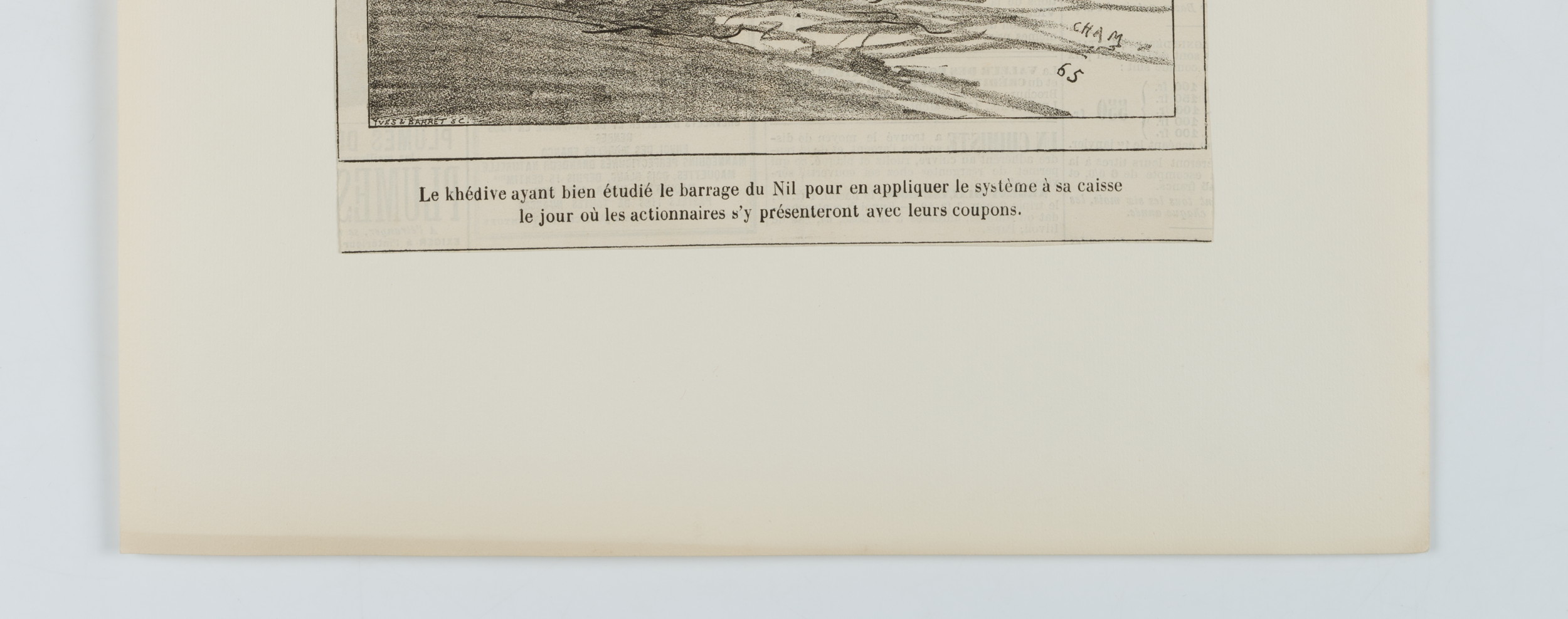 Caption. Translated from French: “The Khedive has studied the Nile Dam well and will apply the system to his coffers when the shareholders turn up there with their demands.” - Verso: Typographic printing, advertisements