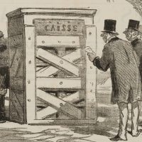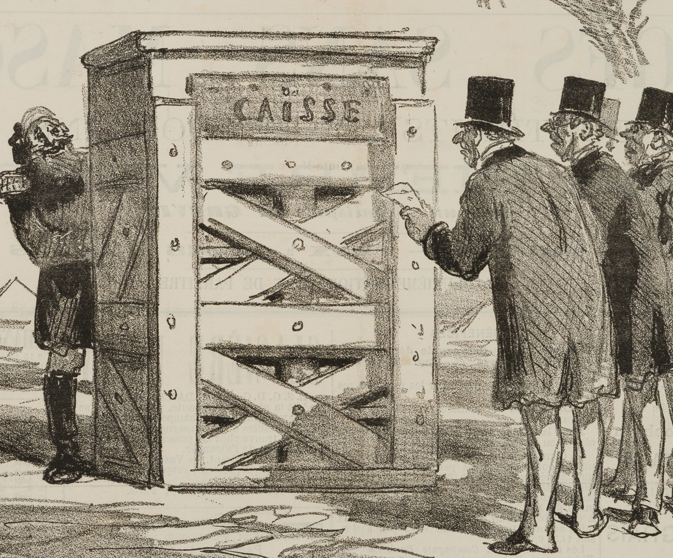 Cham: Amédée Charles Henry de Noé (1819 Paris – 1879 ibid.), Cartoon Dam shareholders in front of barricaded cash box, , Lithography