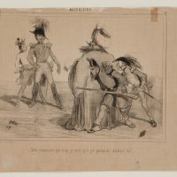 Caption. Translated from the French: “Sire, don’t go too far, I think there’s someone behind him!…”. - Verso: Typographic printing, advertisements