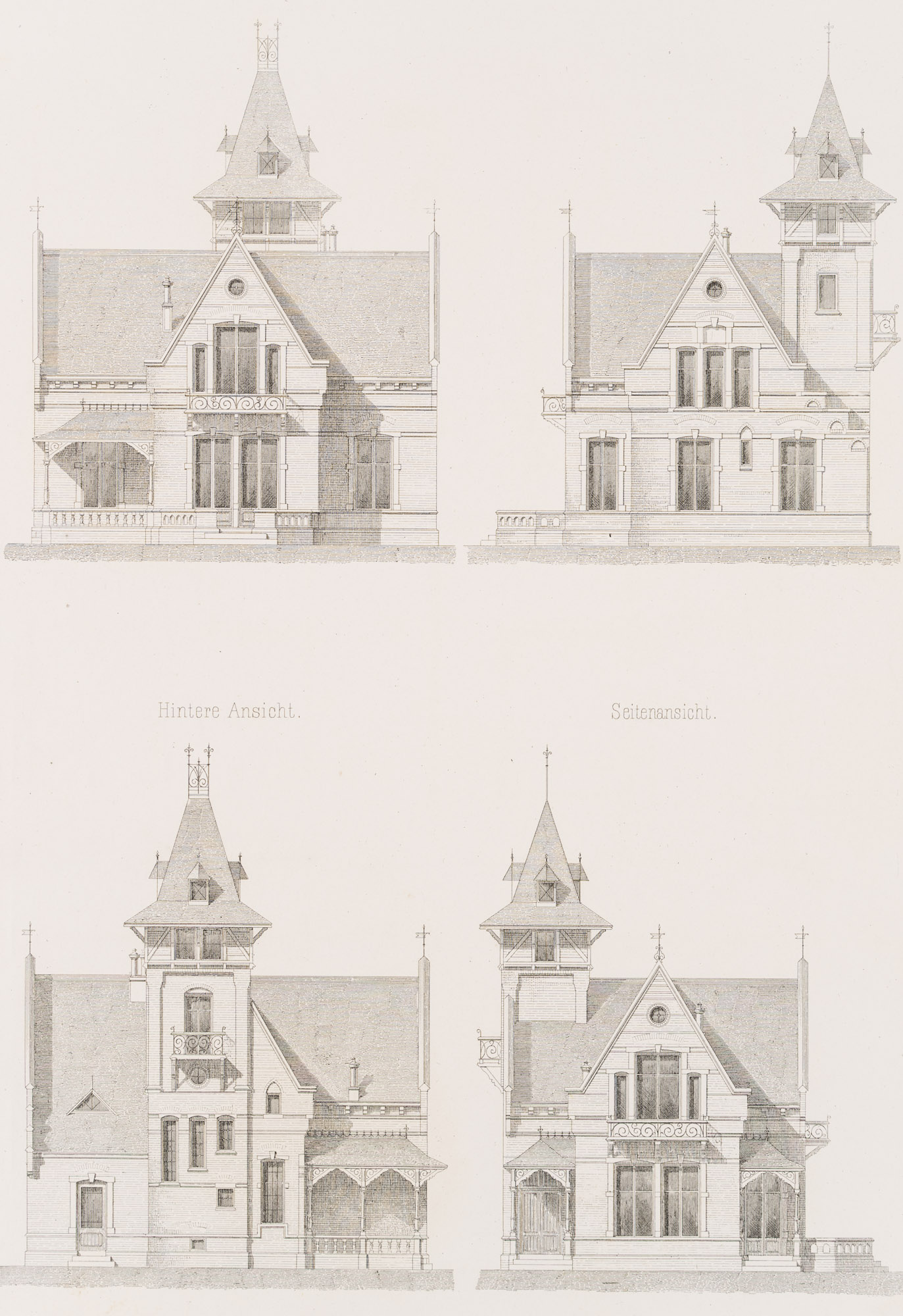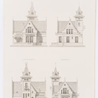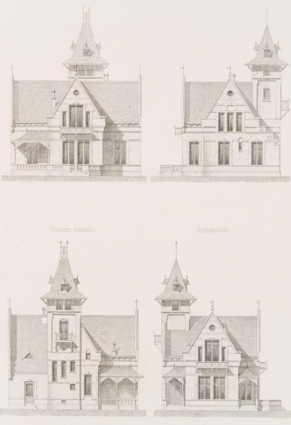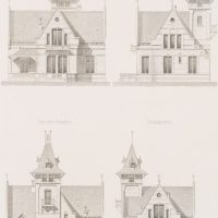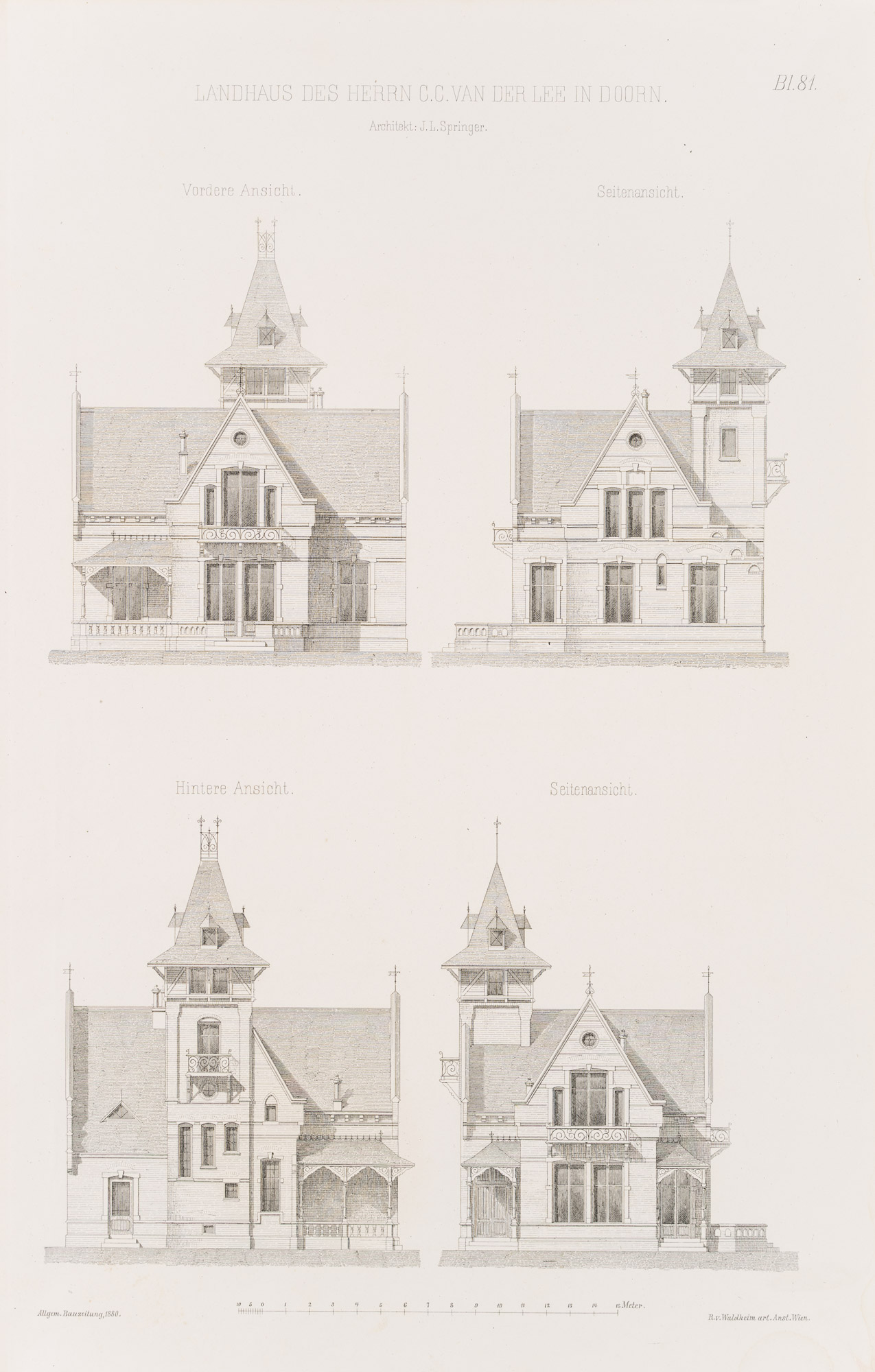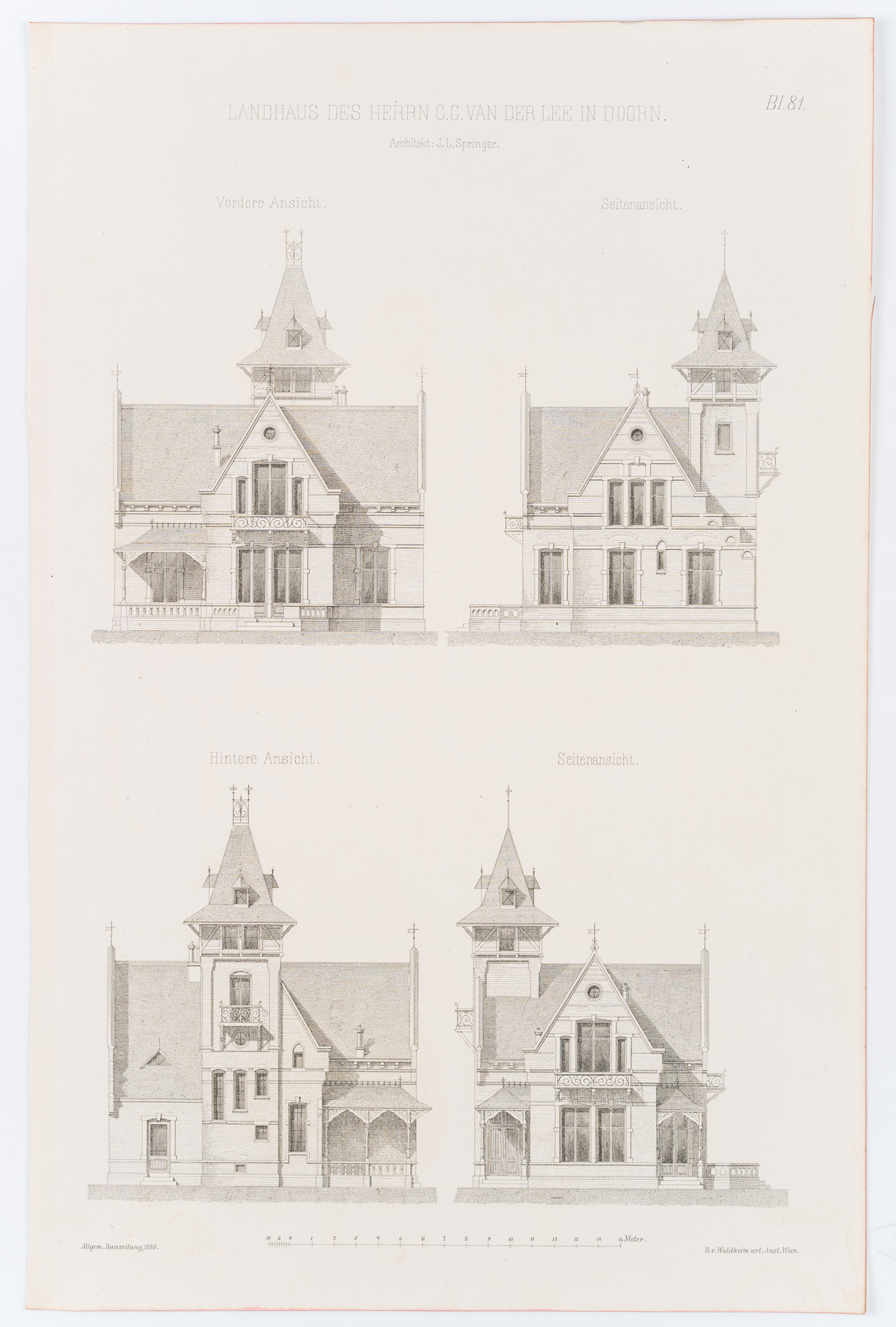 Georges-Simon Le Chatelier (*1857 Paris) nach Johannes Ludovicus Springer (1850 Groningen – 1915 Den Haag), Architekturdarstellung. Landhaus des Herrn C. C. van der Lee in Doorn in vier Ansichten, 1880, Federlithographie